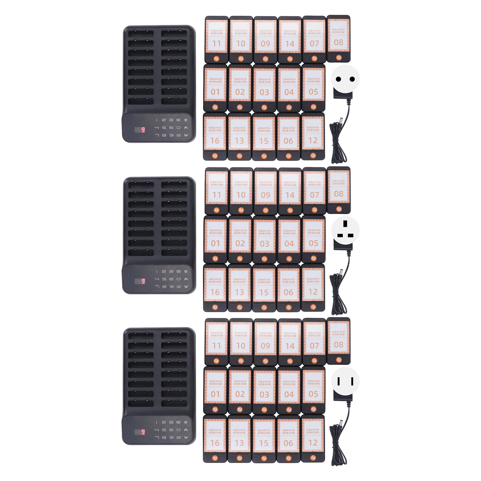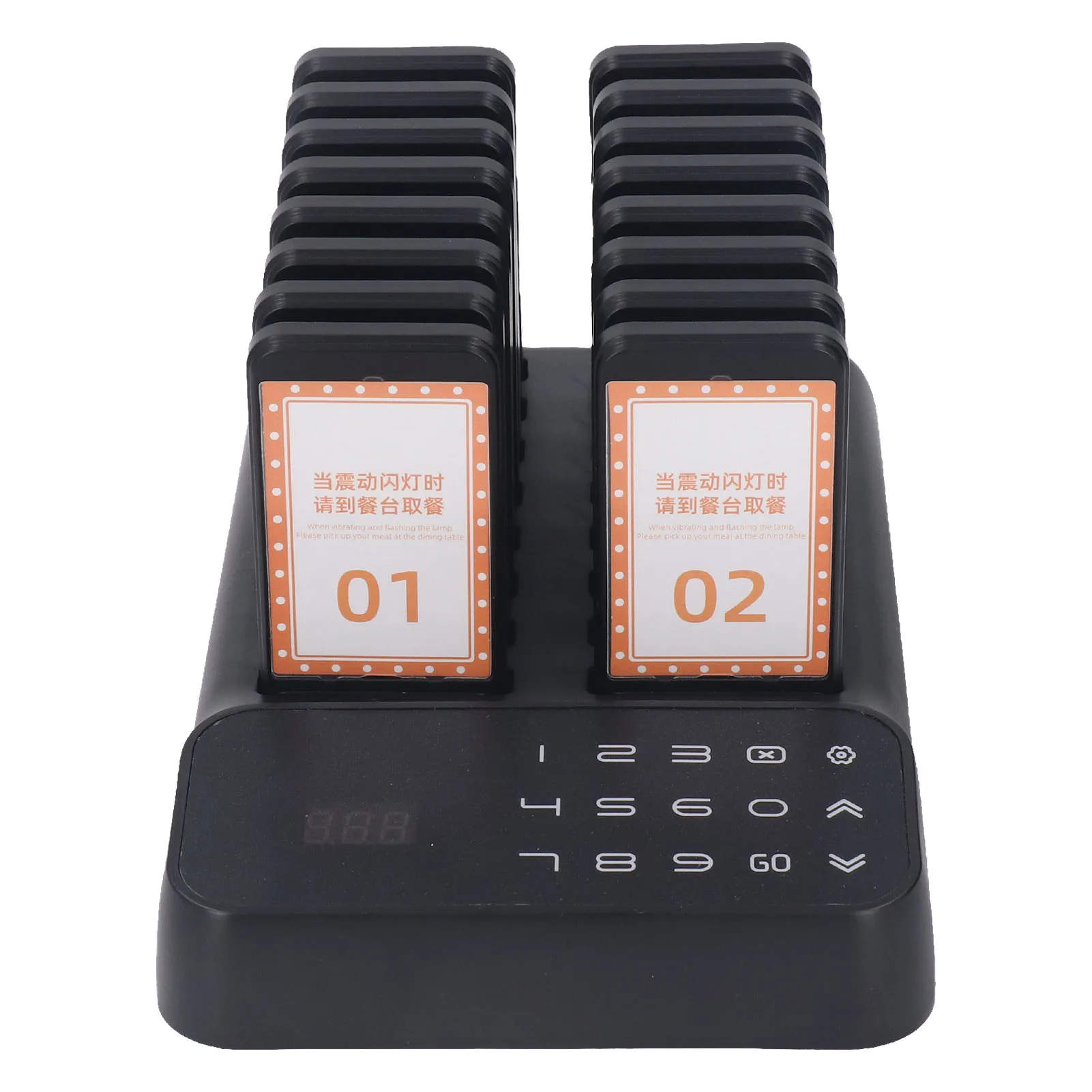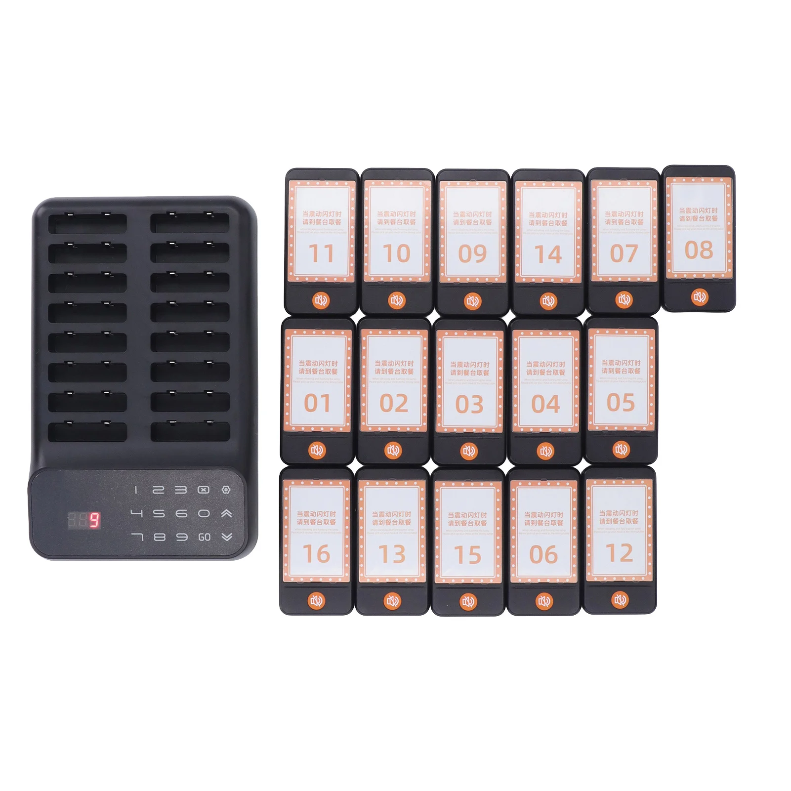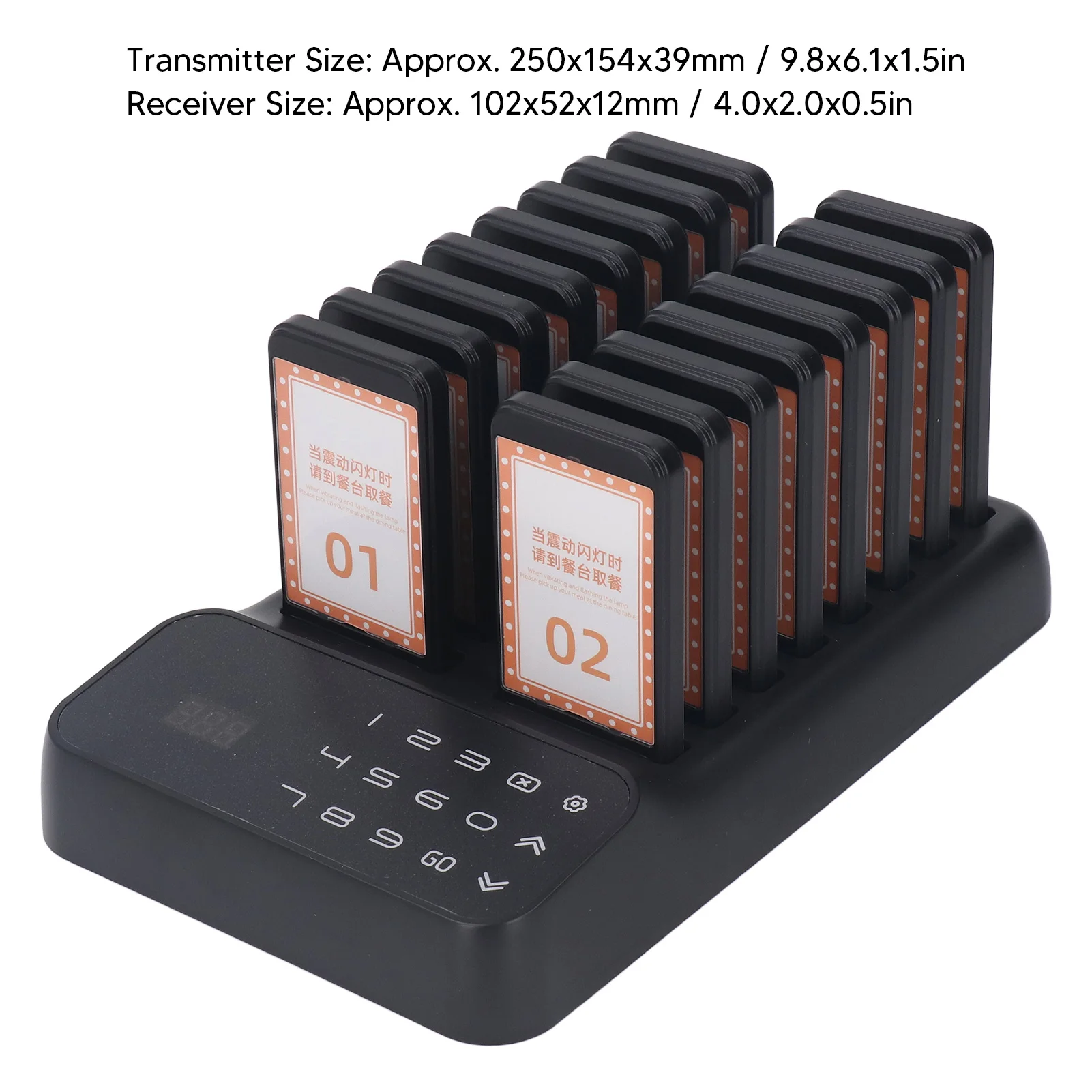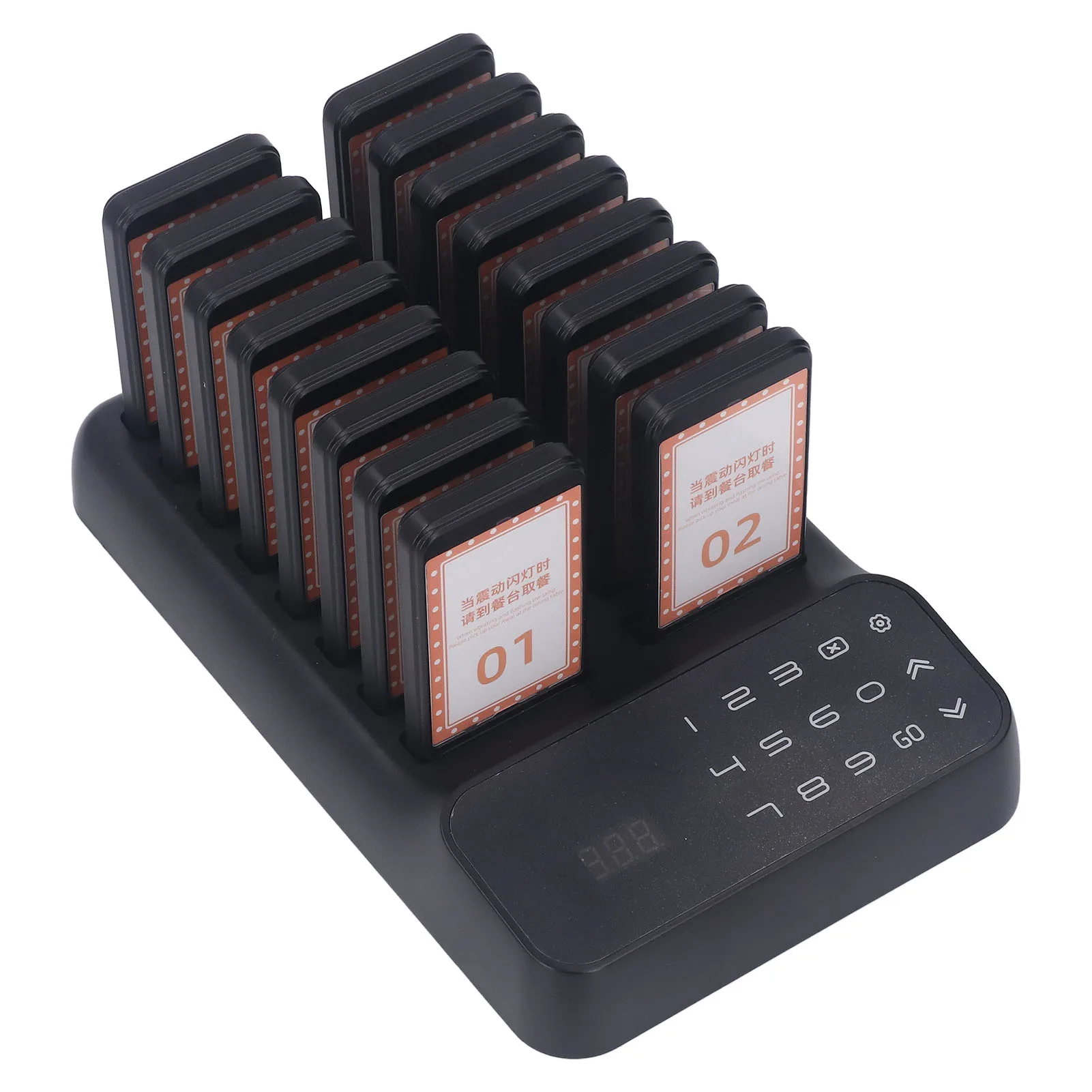 - Includes 16 wireless pagers with 3-digit orange LED displays, allowing clear customer identification, lightweight design, and attached clips for easy belt or pocket attachment.