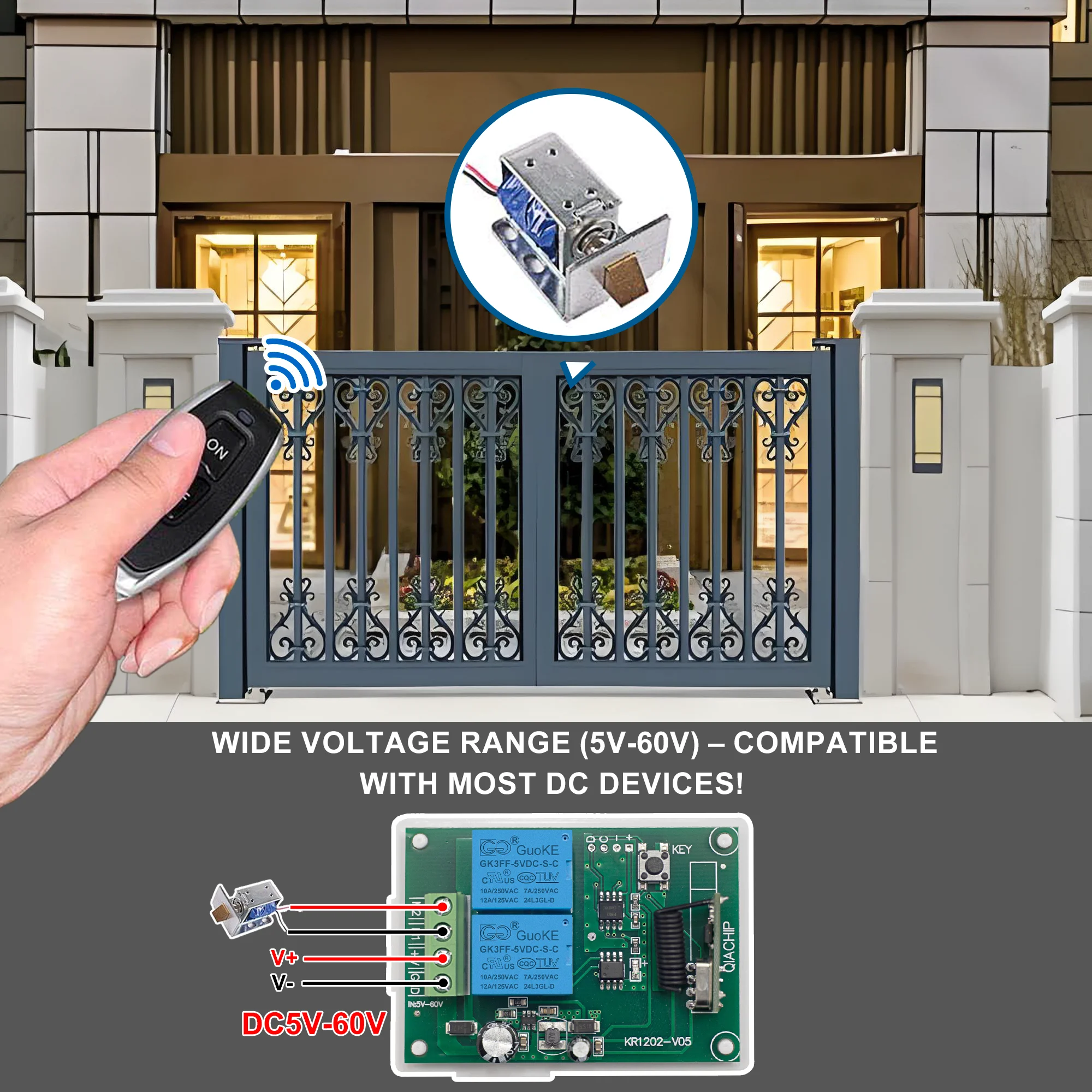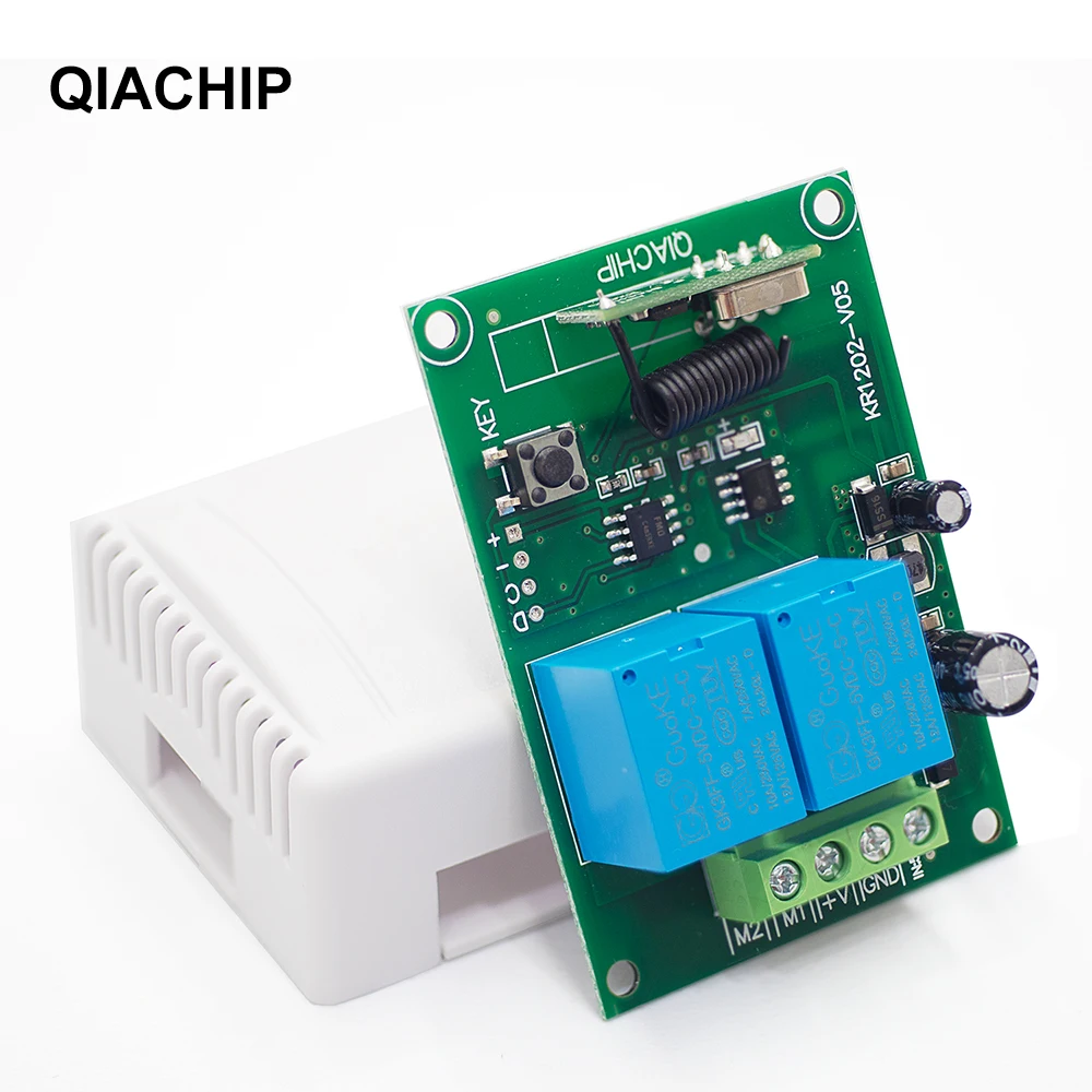 Experience seamless automation with this sleek RF motor remote control switch, designed to fit your needs effortlessly. Its understated black circuit board is accented by vibrant blue relay modules, giving it a contemporary, professional look. The compact size (35mm x 30mm x 18mm) makes installation easy in confined spaces. It supports a wide range of DC voltages (6V to 60V), making it versatile for various motorized applications. The device features three operation modes—momentary, toggle, and latching—providing flexible control options. Its learning function supports up to two remote buttons, instantly recognizing remote signals with a sensitivity of -105dBM. The power LED indicator also displays interference status, ensuring reliable operation every time. This switch guarantees precise, reliable control for your electric doors, curtains, or other motor-driven devices, boosting automation intuitively and efficiently.