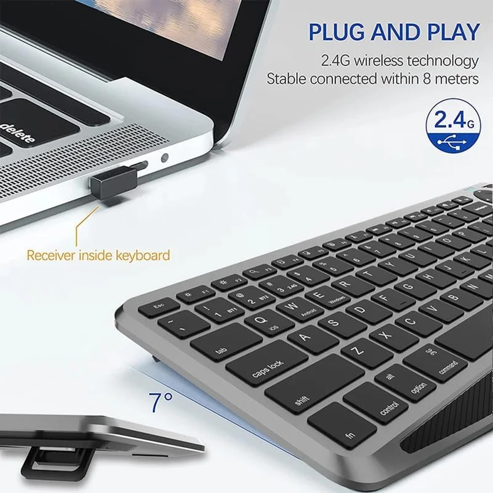 Experience the ultimate convenience with this sleek, modern wireless keyboard designed to seamlessly connect via 2.4G Bluetooth or USB. Its full-size layout features a sturdy, matte gray body with rounded edges, creating a minimalist and stylish appearance. The low-profile black keys are laser-etched for durability and comfort, combined with vibrant RGB backlighting in purple, cyan, and green that can be customized to match your mood or workspace. Built-in a 1000 mAh rechargeable lithium battery, it supports multiple devices, including laptops, tablets, phones, and TVs, with easy switching using FN + 1/2/3. Its ergonomic stand and soft keys with scissor switches ensure long-lasting comfort and quiet operation, perfect for productivity or entertainment. Bring this advanced, adaptable keyboard into your daily routine for effortless control and style.