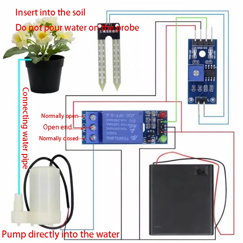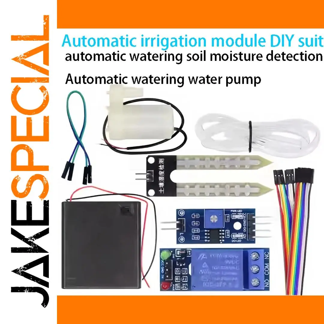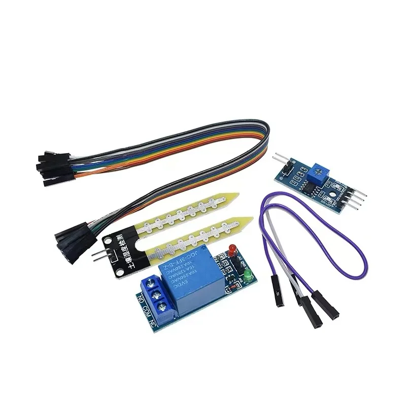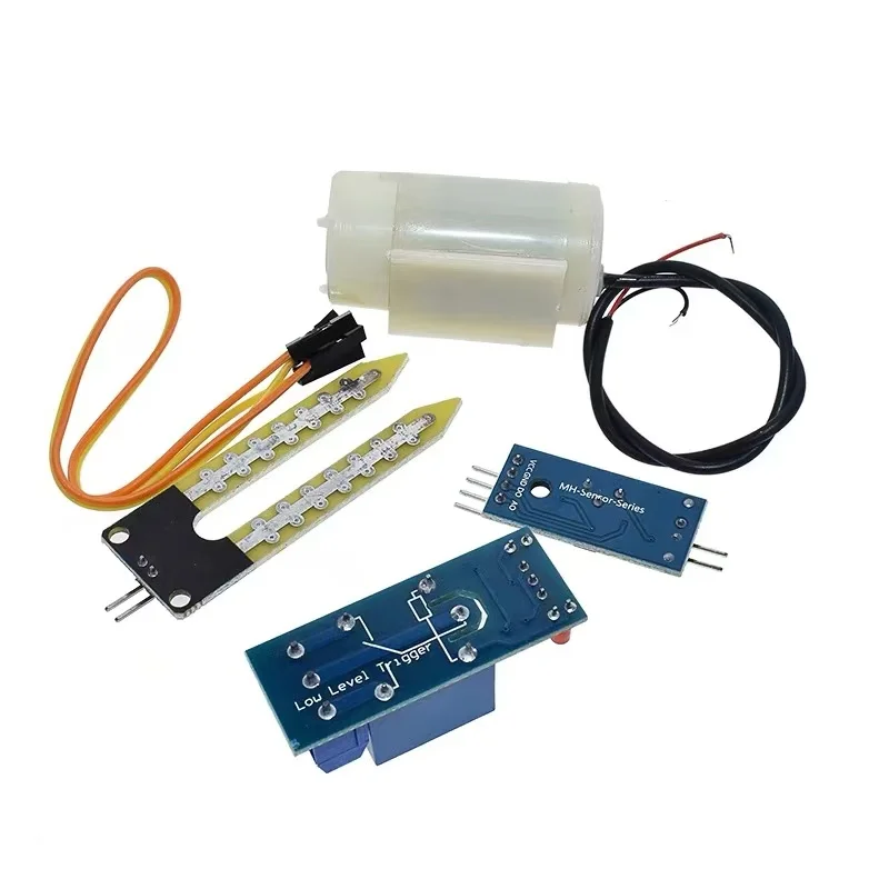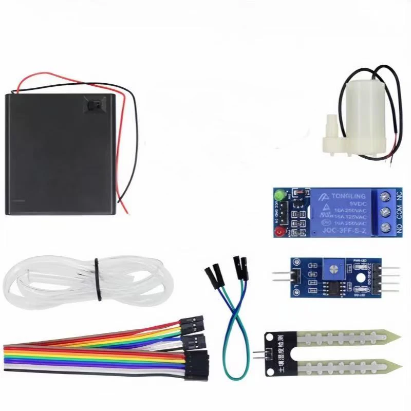 This automatic irrigation system kit includes a 5V relay module for controlling water pumps, fork-shaped soil humidity sensors with indicator lights for accurate moisture detection, and a compact, 5V submersible water pump with red and black power lines. Featuring multi-colored jumper wires for easy connections and a sleek, functional design, it allows you to automate watering based on soil moisture levels, ensuring healthy plant growth. The system is built for reliable, continuous operation without harmful emissions, making it ideal for maintaining gardens, flowerpots, or indoor plants efficiently and conveniently.
