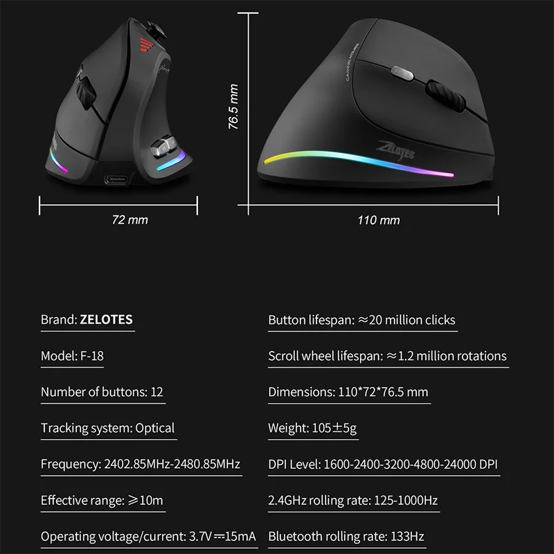 Experience precision and comfort with this wireless vertical gaming mouse, featuring five adjustable DPI levels from 1600 to 24000 DPI, supported by a PAW3325 photoelectric sensor. Its sleek matte black design includes a textured thumb rest, 12 programmable buttons, and a textured scroll wheel rated for 1.2 million rotations. RGB backlighting with dynamic marquee effects in purple, blue, and green enhances its high-tech, ergonomic appearance. Operating via USB with a 1.8-meter cable for wired or wireless use, it offers a resolution range of 1600-24000 DPI and a polling rate of 125-1000Hz. Dimensions: 110 x 72 x 76.5 mm; weight: approximately 165g; compatible with Windows 2000/ME/XP/Vista/7/8 and macOS X (V10.4 and above).