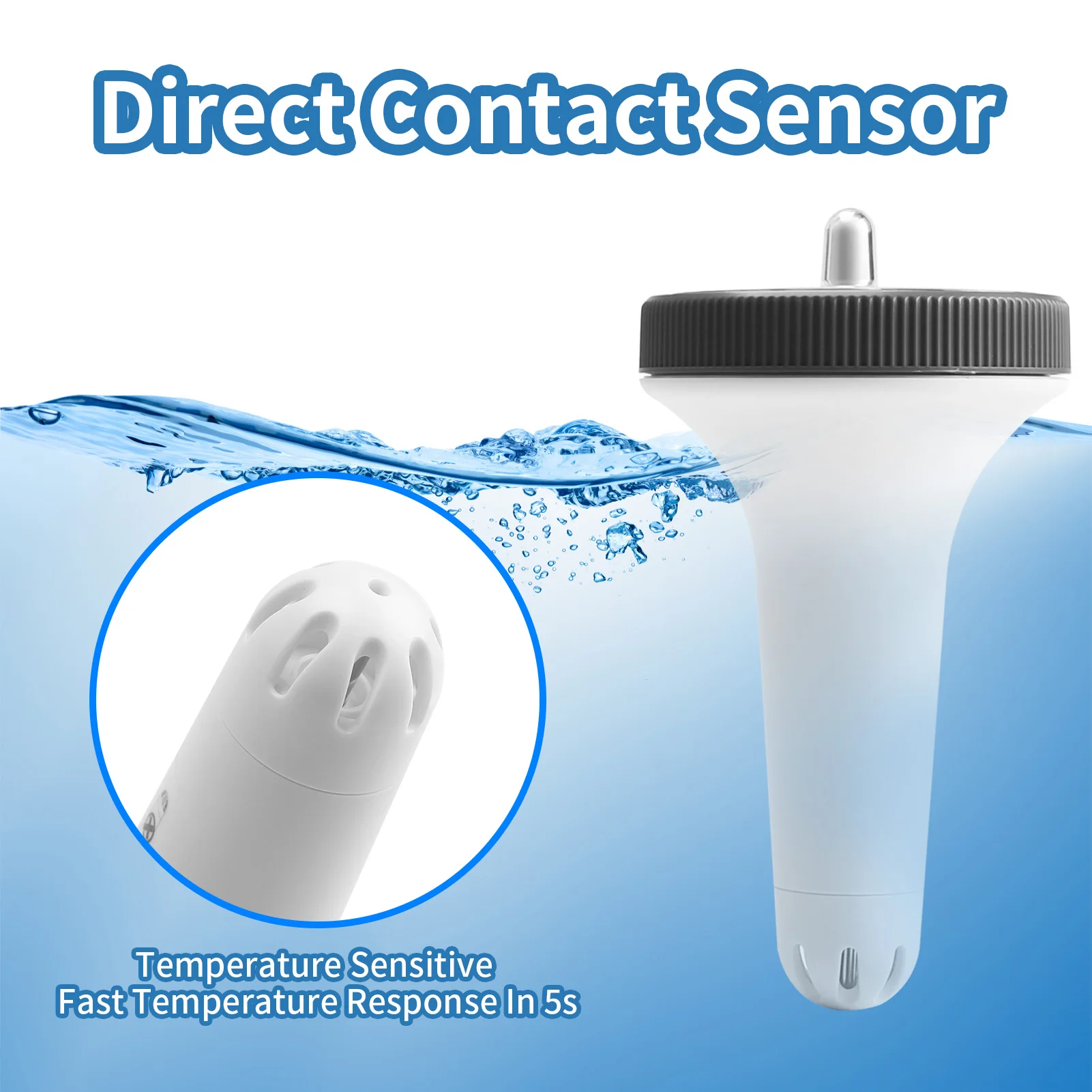 - The compact, floating design features a textured rounded water sensor probe, resistant to water ingress and designed for pools, hot tubs, ponds, aquariums, and baths.