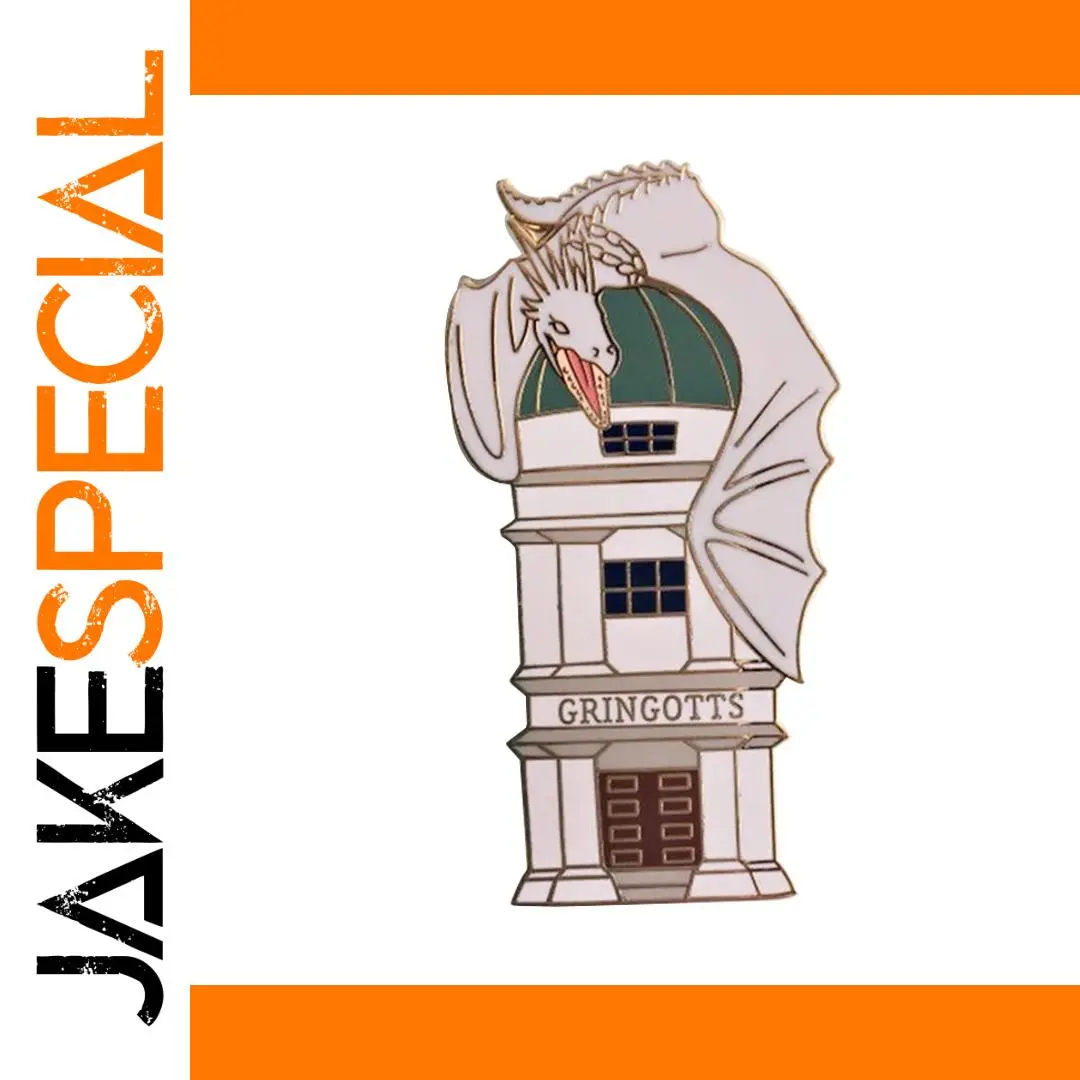 This charming unisex brooch pin, measuring approximately 30 mm, is crafted from warm copper and features a whimsical dragon design inspired by the Wizarding World, specifically associated with Diagon Alley and Gringotts. Its stylized, cartoon-like illustration highlights a playful dragon with an elongated neck, spiky ridges, and a friendly expression, complemented by a classic rectangular bank building with small dark blue square windows and the “GRINGOTTS” inscription. The brooch is secured with a sturdy metal butterfly clasp on the back, making it perfect for showcasing your love for magical lore with a touch of elegant craftsmanship.