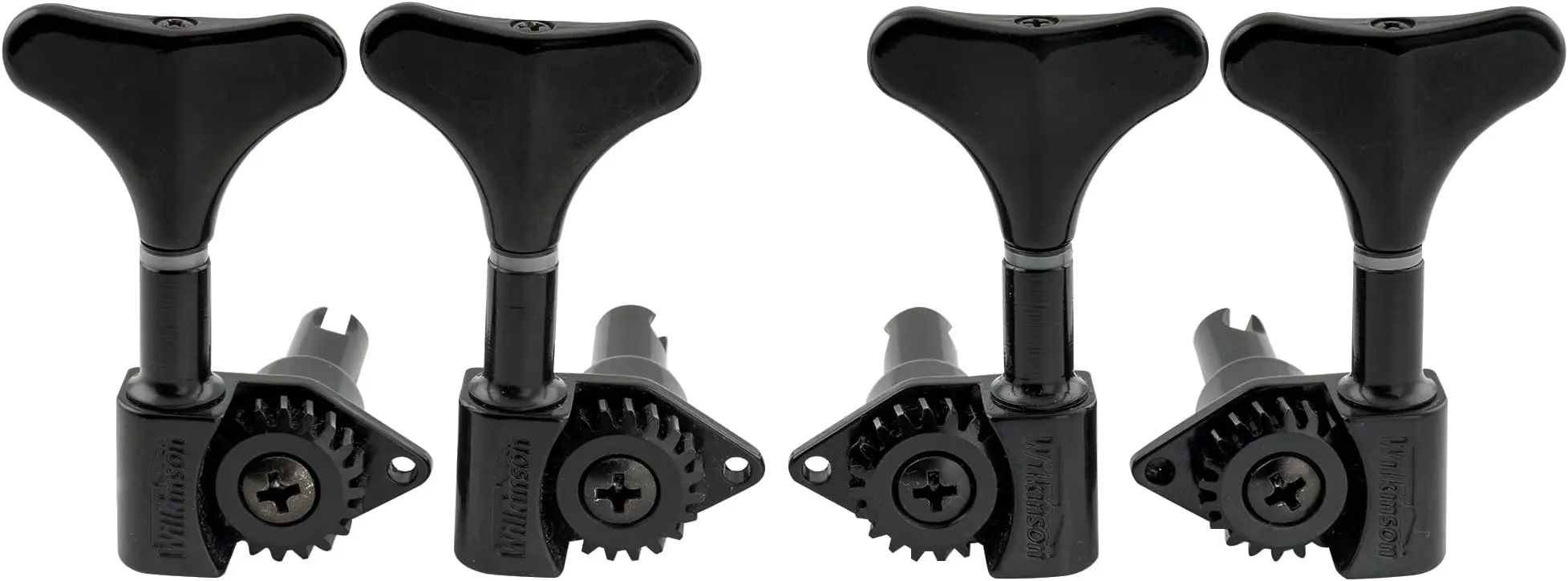 Imagine enhancing your bass guitar with these sleek, black Wilkinson electric tuning machine heads. Designed with a modern open gear configuration, they showcase fine gear teeth for precise tuning adjustments. The broad, rounded T-shaped knobs are ergonomically shaped for comfortable handling. Constructed from durable metal with a matte black finish, these tuners blend industrial appeal with minimalist style, ensuring your instrument performs flawlessly while looking professional. Their versatile design fits various bass models, transforming your playing experience. Whether you're upgrading or replacing, this set ensures a secure, stable fit. Visualize your bass guitar’s headstock with these striking, functional tuners, elevating your gear's aesthetic and performance in one seamless upgrade.