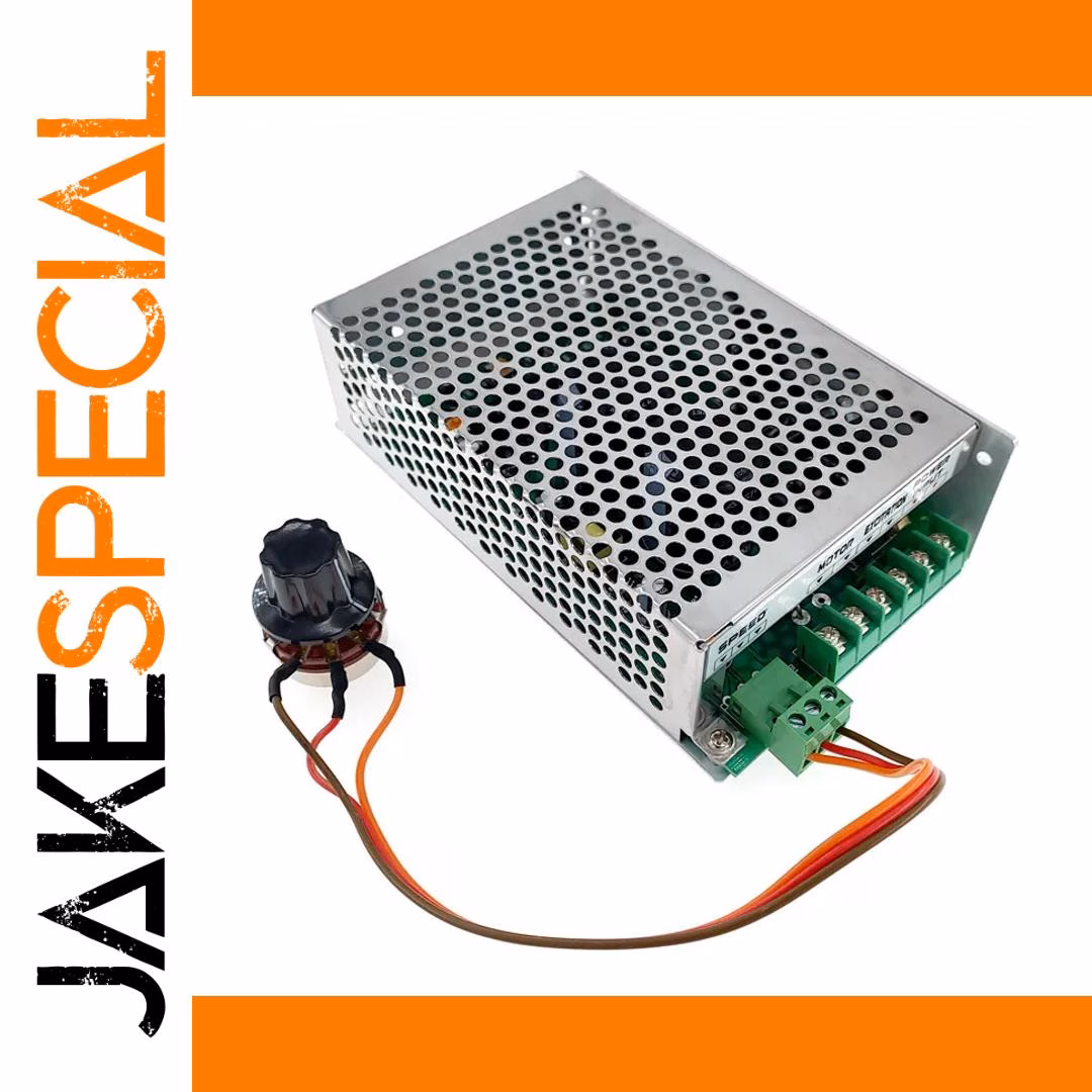 Experience precise control with this WK822 PWM speed regulator designed for DC motors. Crafted with an industrial aesthetic, it features a robust rectangular metal enclosure finished in sleek metallic silver, emphasizing durability and professionalism. The perforated surface with evenly spaced circular ventilation holes ensures excellent airflow for heat dissipation, maintaining optimal functionality during extended use. Green screw terminal connectors facilitate secure electrical connections, while the multi-wire cable with red, orange, and black wires adds a vibrant contrast. The inclusion of a textured black rotary knob, mounted on a small round base with black and red wires, allows manual adjustment of motor speed, making it ideal for both industrial and hobbyist applications. This high-quality device offers reliable, efficient motor control in a compact, professional package.