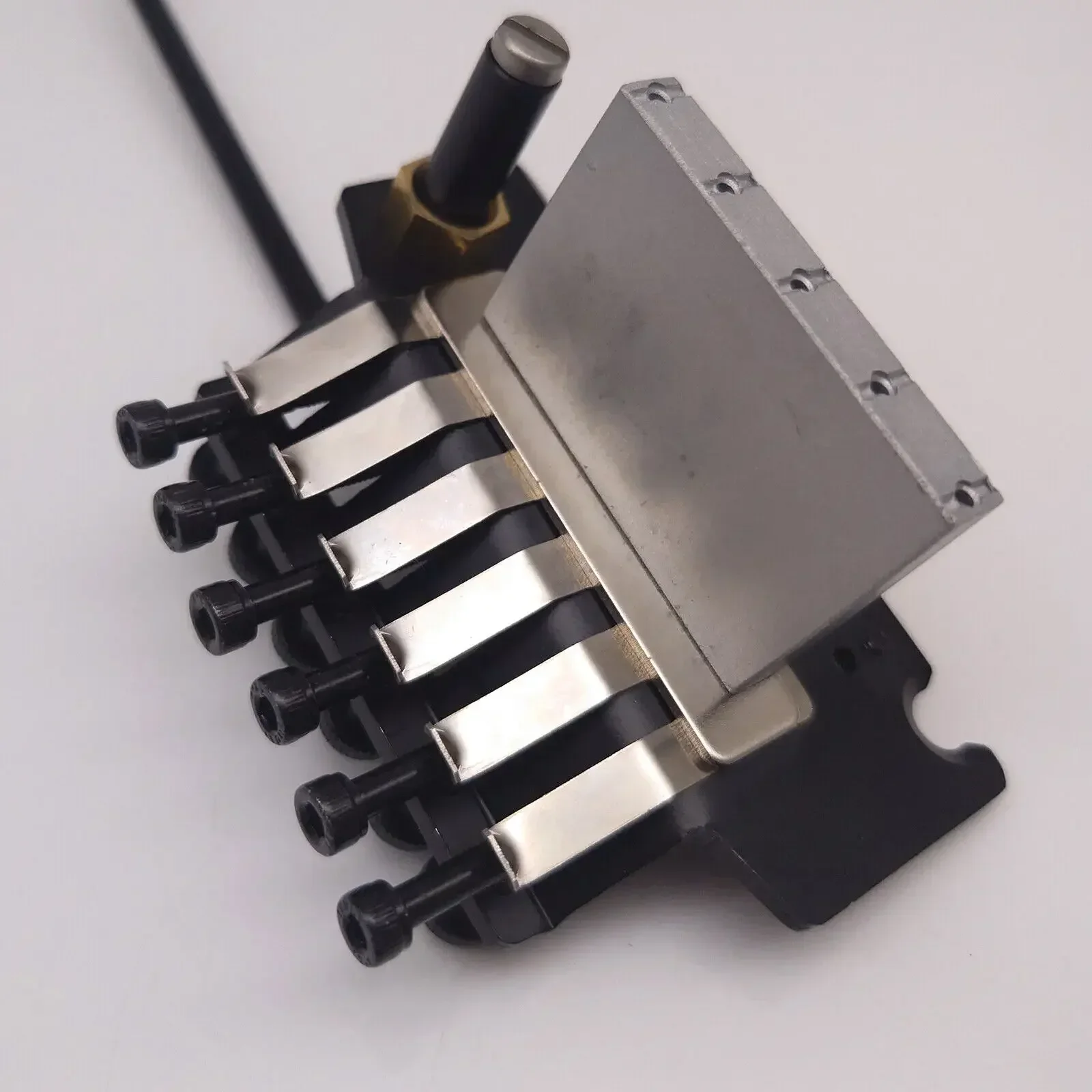 Imagine your guitar reaching new levels of performance with this meticulously designed WODL1 6-String Electric Guitar Bridge. Crafted from durable steel and diecast zinc, it offers a perfect balance of stability and resilience under rigorous play. The sleek black finish on the base plate provides a modern, metallic aesthetic that complements any guitar style, while the nickel saddles add a touch of elegance and improved tonal quality. The compact, rectangular profile with rounded edges ensures durability and comfort. Featuring a smooth, adjustable tremolo arm, this system enables nuanced vibrato effects. Its high-quality construction guarantees precise, responsive tuning and tone, so you can focus on your playing without worry. This is a reliable upgrade or replacement designed for serious musicians eager to enhance their sound.
