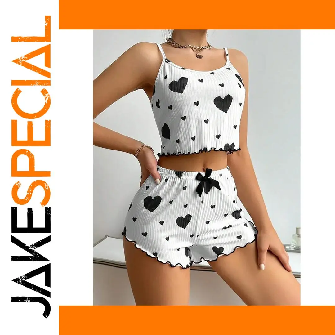 Indulge in the ultimate relaxation experience with this Women's Pajamas Set, a delightful two-piece sleepwear ensemble crafted for comfort and style. The set features a cropped tank top with thin spaghetti straps, complemented by matching shorts, both adorned with adorable black heart shapes against a crisp white backdrop. The elastic waistband gives you a perfect fit, while the playful bow detail adds a charming touch. Made from breathable materials, this sleepwear is perfect for lounging at home or a cozy night's sleep. Picture yourself unwinding in this chic outfit, embodying a casually cute aesthetic that radiates comfort and confidence.