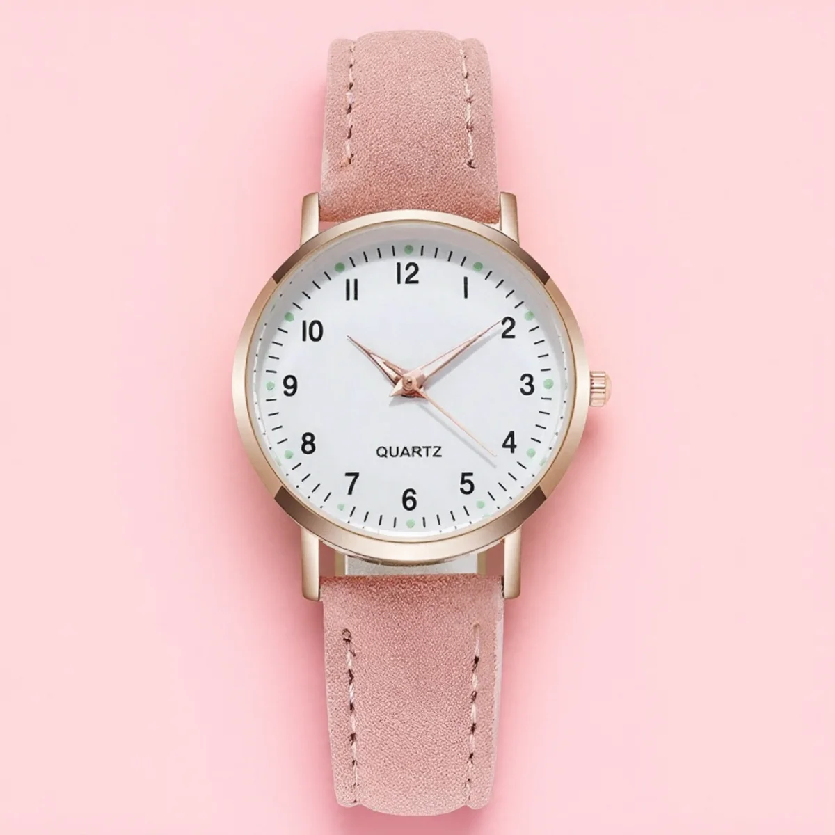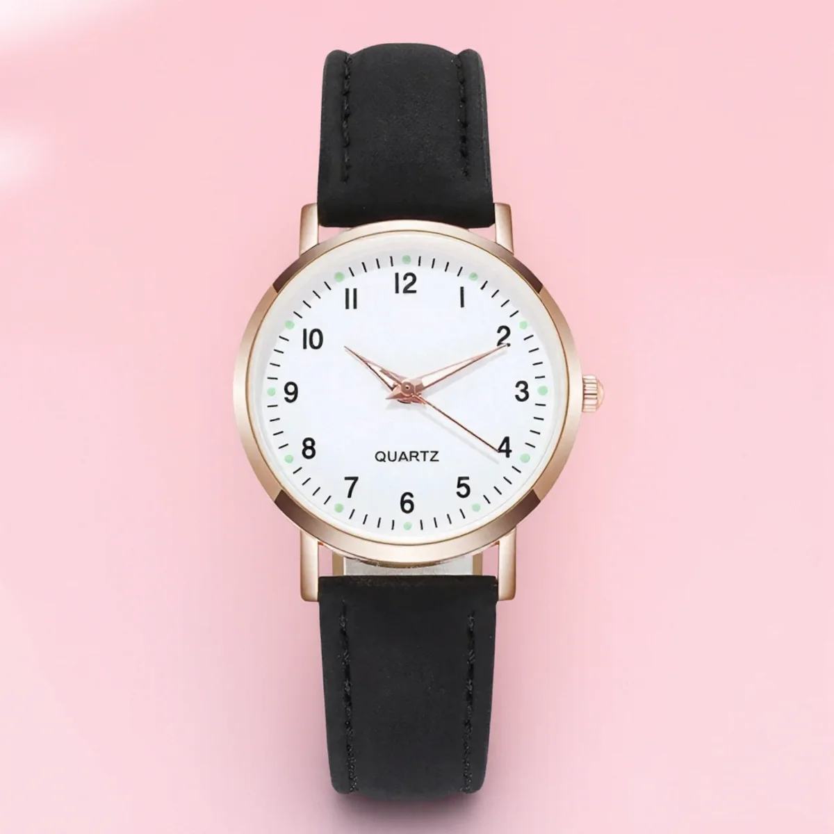 Experience everyday sophistication with this women’s casual round quartz wristwatch, model A106. Designed to complement any outfit, it features a sleek 32.5mm alloy case with an 8mm thin profile, providing a modern, slim silhouette. Its white dial boasts bold black Arabic numerals and luminous green dots at each hour mark, ensuring excellent readability even in low light. The watch hands are delicately crafted in a matching metallic hue—either rose gold, silver, or black—adding a touch of elegance. The genuine yet affordable imitation leather strap is 16mm wide, adjustable with a hook clasp, and measures 225mm including the case, securing comfortably around your wrist. Lightweight at 22 grams, this stylish accessory is perfect for daily wear and casual occasions, elevating your everyday look effortlessly.