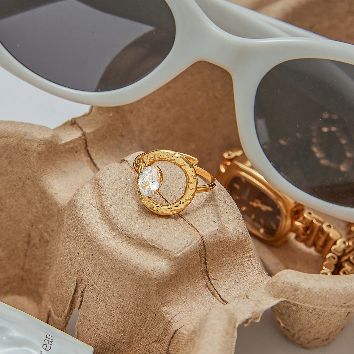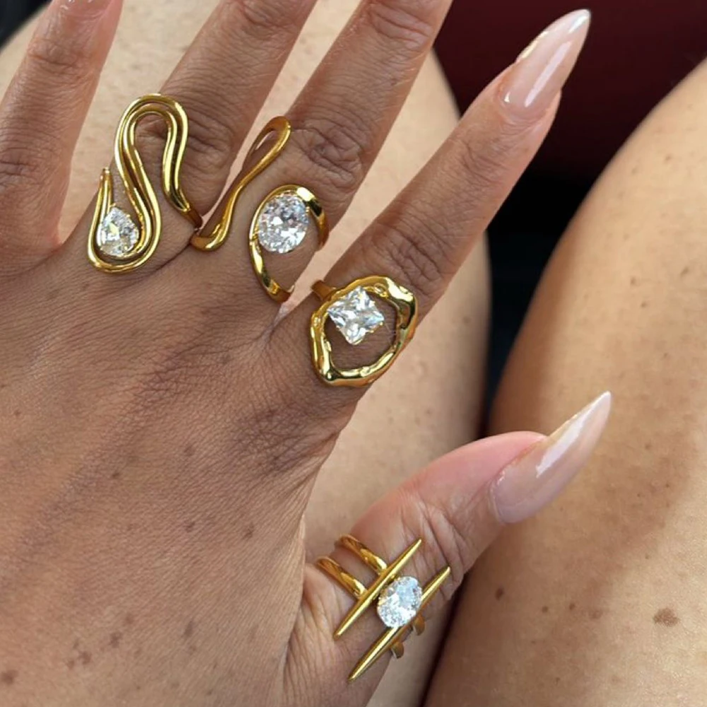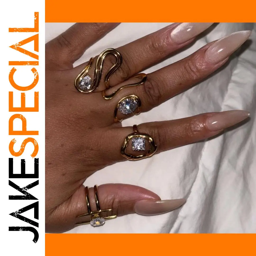 Experience a sophisticated yet trendy touch with this women's stackable zircon ring set, crafted from durable stainless steel with a luxurious gold finish. The collection features an array of bold yet elegant designs, perfect for adding a fashionable edge to party outfits or special occasions. The irregular elliptical shapes and smooth line art create a modern aesthetic that complements any style, while the sparkling zircon stones catch the light beautifully. With versatile stacking options, you can mix and match these rings for a personalized look. Designed for durability and fashion, these rings are suitable for daily wear or glamorous events, elevating your jewelry collection effortlessly.