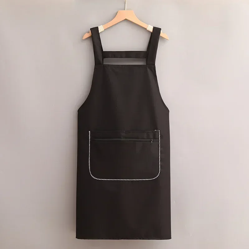 Imagine elevating your professional or casual work attire with this sleek, black waterproof apron. Made from lightweight knitted polyester fiber, it offers a smooth, comfortable fit for extended wear. Its minimalist design features straight lines, large front pockets with white stitching accents, and zipper details, blending functionality with modern style. Whether you're in a kitchen, café, beauty studio, or bar, this apron provides durability and ease of movement. Its waterproof nature keeps you dry, and the high-quality construction ensures long-lasting use. The apron’s simple yet polished look makes it perfect for creating a professional impression while staying comfortable during busy workdays or casual activities.