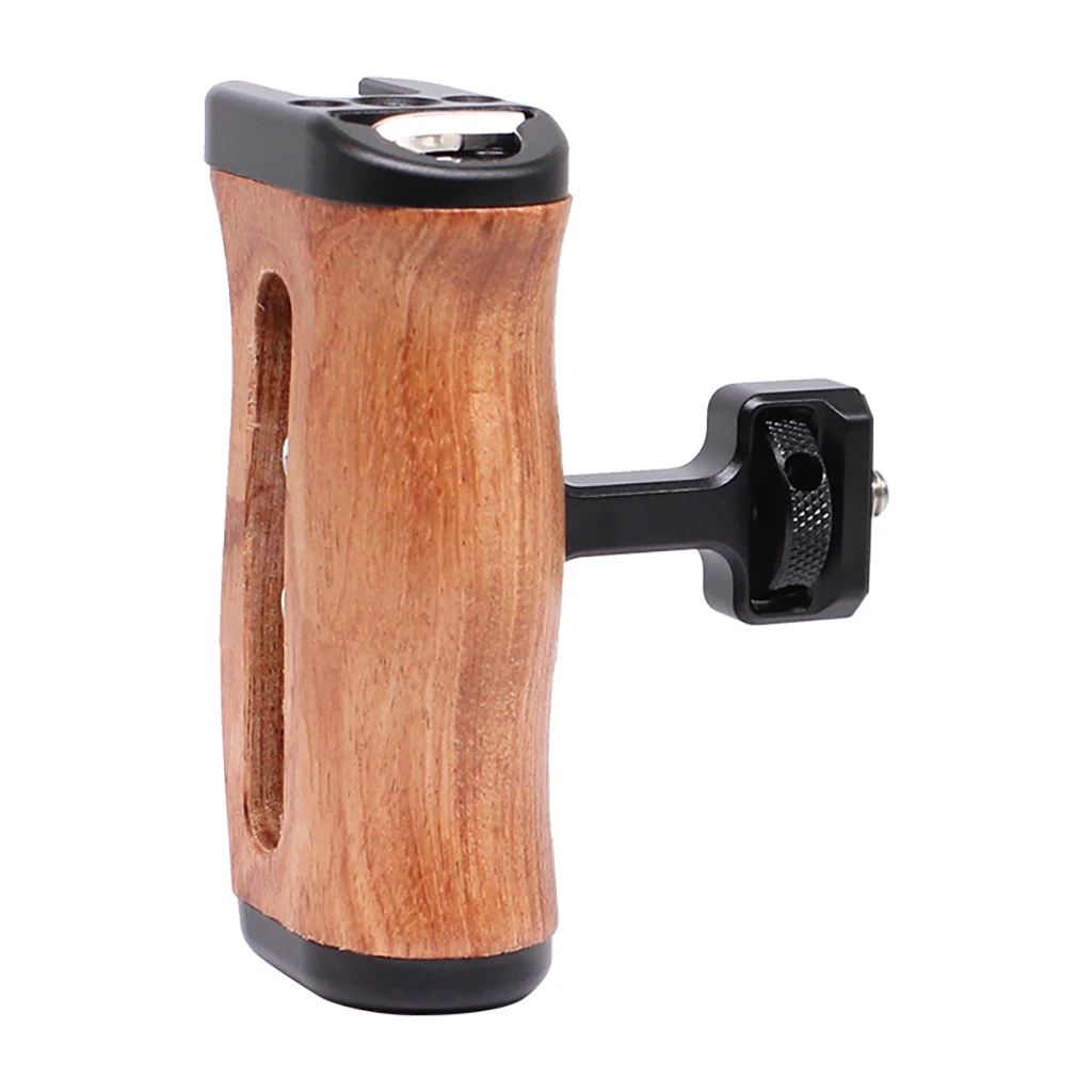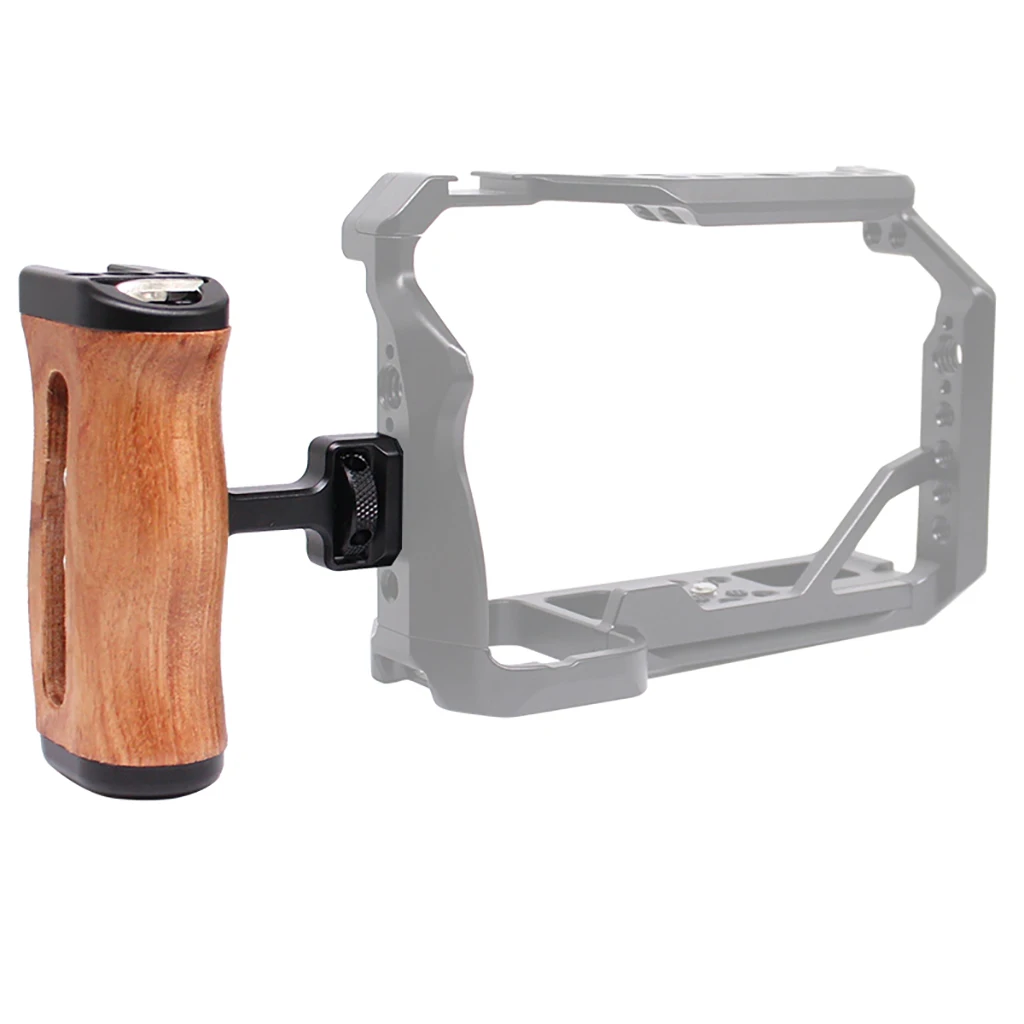 Enhance your camera rig setup with the FEICHAO Aluminum Alloy Extension Grip Model 54483, a universal SLR wooden side handle in sleek black. Crafted from durable aluminum alloy, it offers a sturdy, lightweight grip compatible with ARRI, SmallRig, and Tilta cage rigs, ideal for DSLR cameras. The ergonomic, polished wooden handle features a natural grain pattern, providing a warm, classic aesthetic while ensuring a comfortable, secure hold with its curved, tapered design. A black metal mounting section with multiple threaded holes allows easy attachment and customization, complemented by a knurled adjustment knob for precise positioning. This high-quality handle combines natural beauty and industrial strength, making it a trusted choice for professional camera setups.