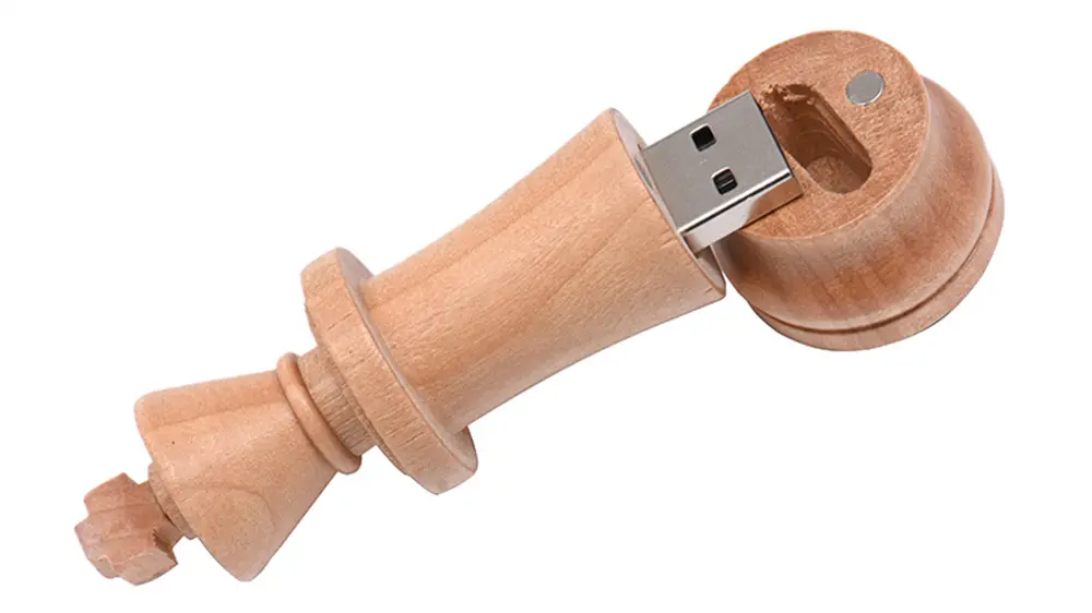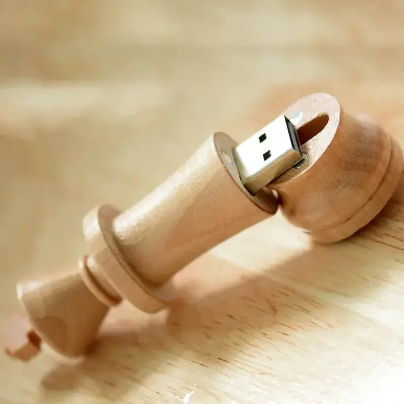 Embrace the unique charm of this Wooden International Chess USB Flash Drive, capturing the elegance of a chess king piece. Crafted from light wood, its polished surface displays a beautiful natural grain, enhancing your tech with an artistic touch. With multiple capacity options, including 128GB, 64GB, 32GB, 16GB, 8GB, and 4GB, this drive caters to various storage needs, whether you're saving precious files or showcasing it as a striking gift for chess enthusiasts. Its compact design ensures portability, while the innovative wooden casing and metallic USB connector make it a functional and stylish accessory for any setting.