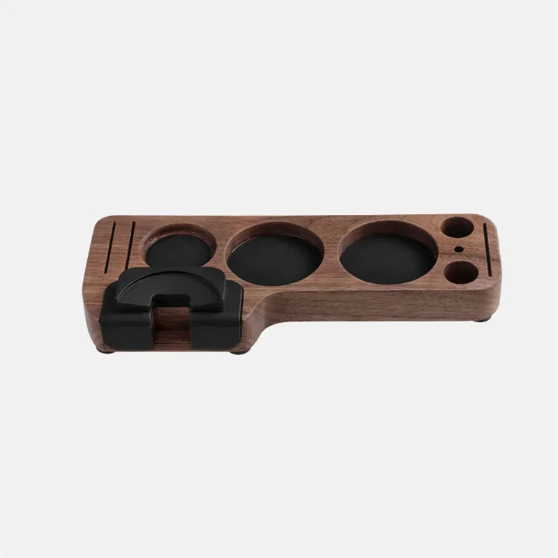 Enhance your coffee station with this elegant, multi-functional wooden tamper stand crafted from premium Walnut, Sapele, Beech, or Pine wood. Designed to accommodate 51mm, 53mm, or 58mm handles, it features circular cutouts and slots for effortless organization of tampers and accessories. The stable, anti-slip silicone base ensures safe, secure placement during use, while the washable design makes cleaning simple and convenient. Its natural wood finish and smooth, rounded edges complement any barista setup, combining a sophisticated minimalist aesthetic with practical functionality. Perfect for creating a refined, inviting coffee environment in your home or professional space.