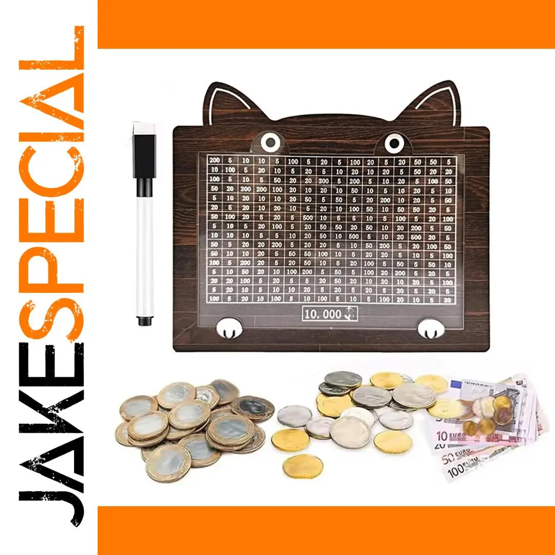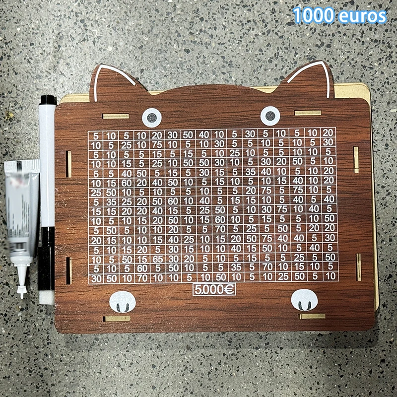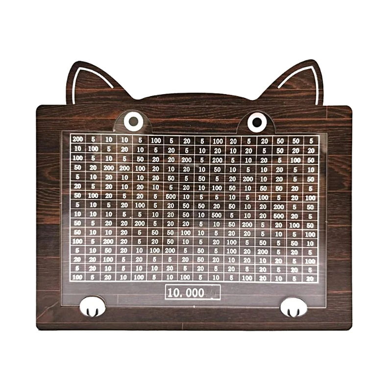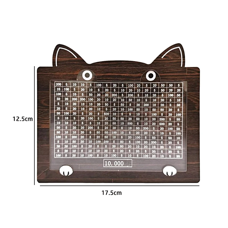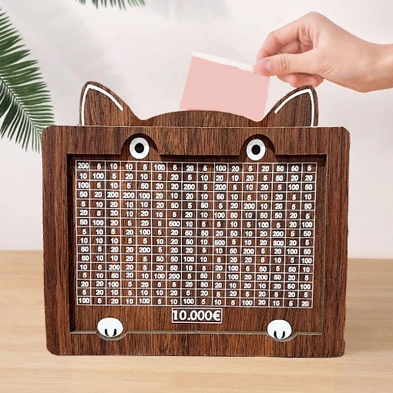 Imagine effortlessly organizing your savings with this beautifully crafted, playful wooden money box. Its smooth, dark polished finish adds warmth and elegance to any space, whether in your home or office. The design features whimsical cat ears at the top, giving it a cheerful, cartoon-inspired charm that appeals to both adults and children. The large, transparent front panel reveals a functional, embedded chart resembling a goal-tracking grid filled with numbers, encouraging you to stay motivated and organized. The included black marker allows you to update your savings progress easily. With its sturdy, reusable structure, this money box combines aesthetic appeal with practical use, making saving money a delightful and engaging experience.