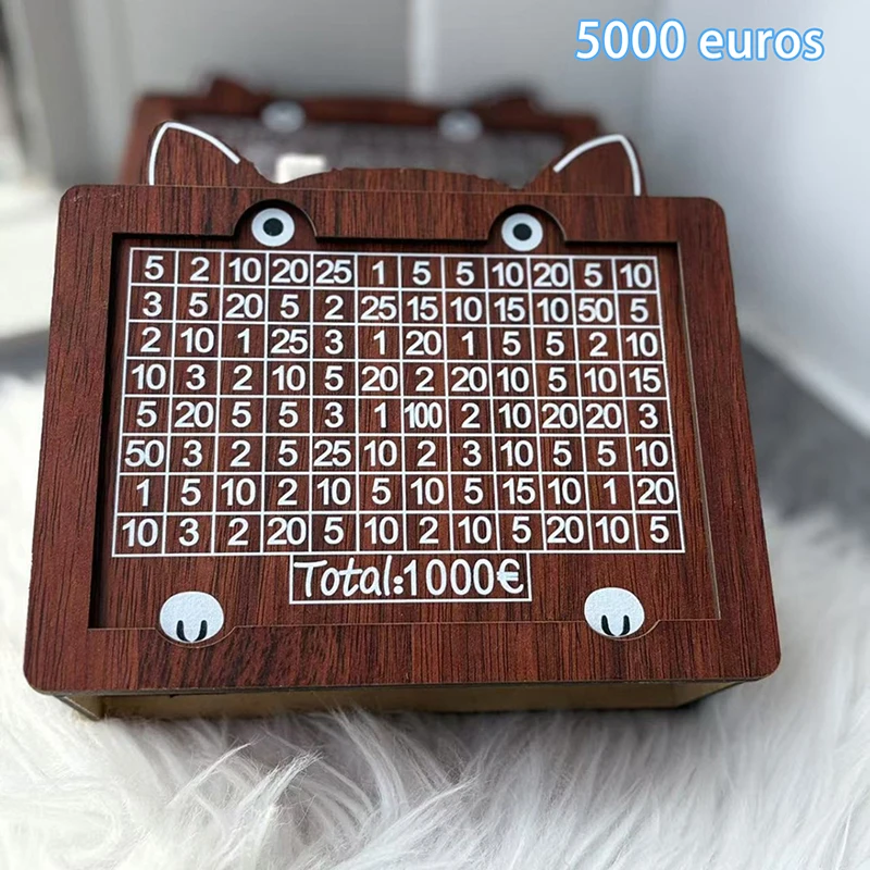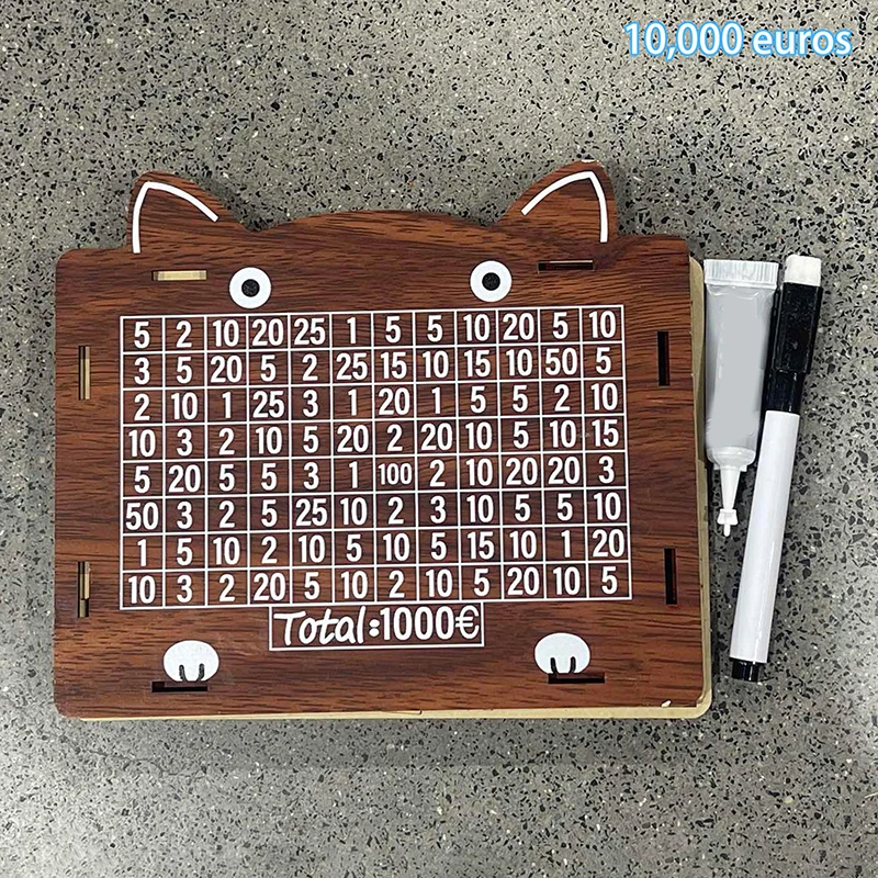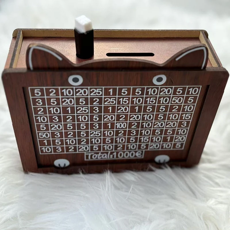 Envision yourself confidently tracking your savings with this delightful wooden bank by your side. Its charming design not only inspires you to reach your goals but also adds a cozy, playful touch to your space. Whether for personal savings, a gift, or a motivational tool, this money box combines style and practicality effortlessly. Made to last and easy to update, it becomes a trusted companion on your journey towards financial achievement. Invest now in this unique, goal-oriented savings box and enjoy the satisfaction of watching your savings grow over time.