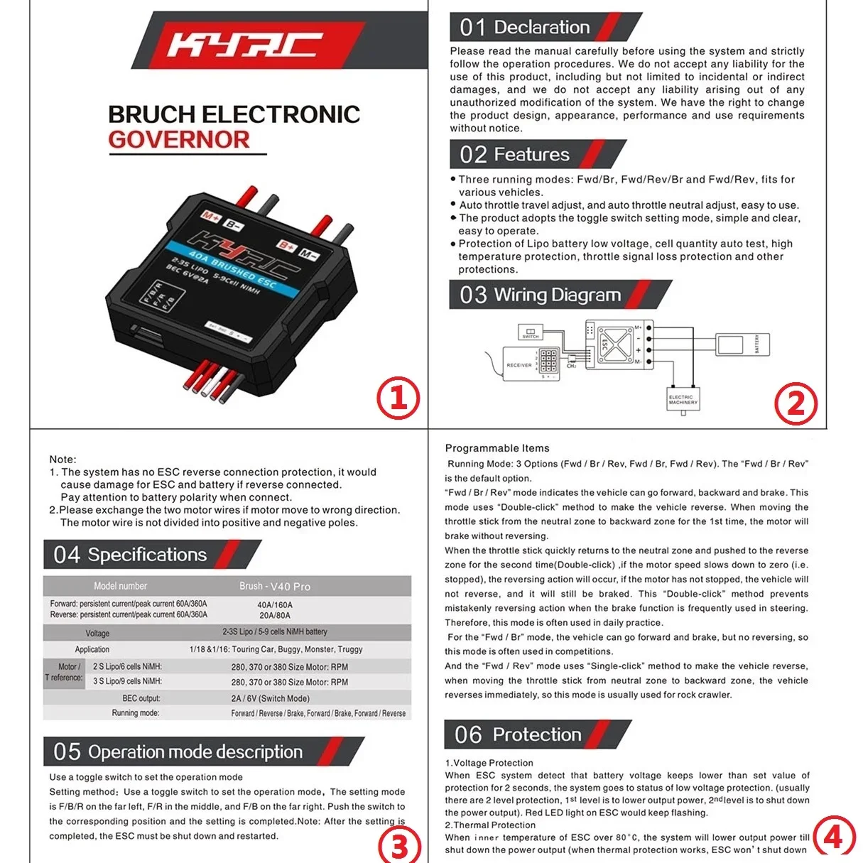 - The device features a 3A / 6V BEC in switching regulator mode, providing stable power output for your vehicle's servo or receiver.