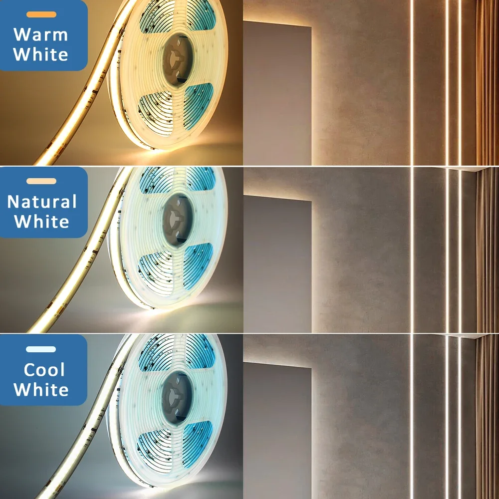 - High-density 360 COB LEDs per meter with three color choices—cool white, warm white, and natural white—covering a color temperature range of 3000K to 6000K for customized ambiance.
