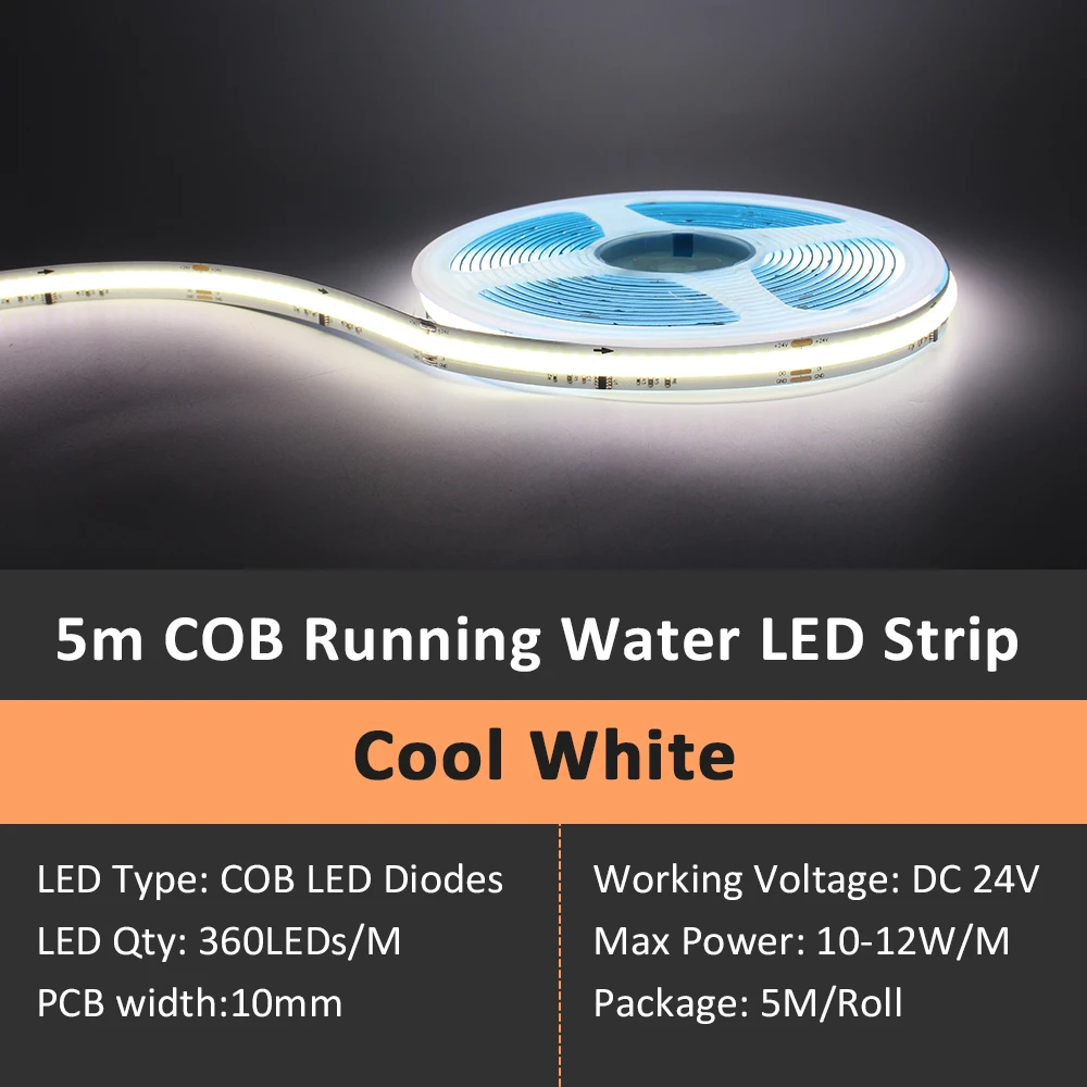Experience a stunning, flowing illumination with this sophisticated WS2811 COB running water LED strip. Designed for 24V DC operation, it boasts a sleek 10mm wide, flexible surface that mimics the smooth, dynamic effect of flowing water. With 360 LEDs per meter, available in cool white (6000K), warm white (3000K), and natural white (4000K), it offers versatile lighting options perfect for any setting. The minimalist white strip with embedded copper contacts provides a contemporary aesthetic that seamlessly integrates into modern decor. The powerful yet compact control system enhances your lighting experience via a 2.4G RF remote, allowing for effortless remote control over seven dynamic modes, brightness, and zone independence. Elevate your lighting projects with this premium LED strip for a visually captivating atmosphere.