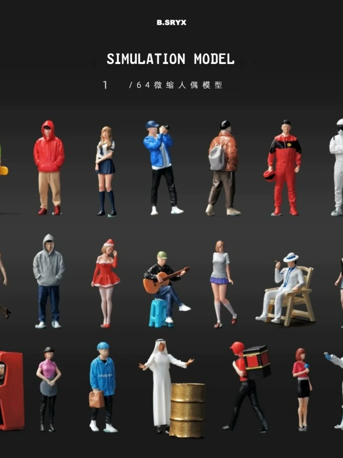 Introducing the WT9 1/64 Miniature Doll Model Collection, featuring intricately crafted resin figurines, each standing approximately 2.6 cm high. These vibrant models exhibit a range of contemporary clothing styles and are manually colored and polished for a stunning finish. Perfect for DIY landscaping and small-scale photography, these miniatures match seamlessly with miniature scenes and proportional car models. With dynamic poses and expressions, they bring your displays to life, ideal for collectors and photography enthusiasts alike. Elevate your creative projects with these captivating character models and enjoy the endless possibilities they offer for visual storytelling.