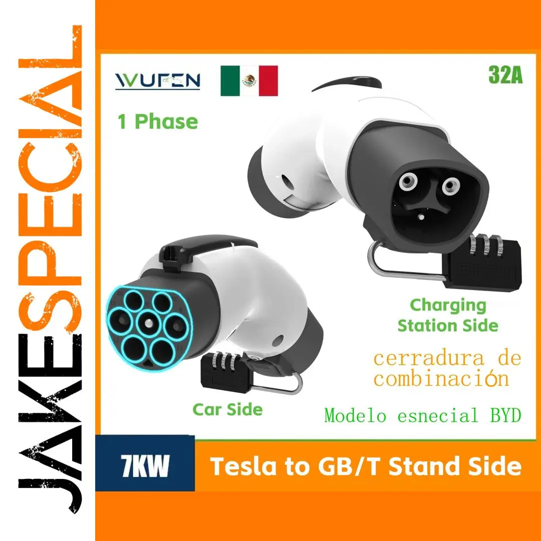 Experience seamless, high-powered charging with this WUFEN EV charger, exclusively designed for BYD vehicles. Its sleek white and black modern aesthetic blends durability with style, ideal for outdoor setups. The circular car connector emits an energetic blue glow, highlighting its advanced connectivity. The compact design features smooth contours and a textured grip on the lockable adapter, ensuring secure handling. Crafted from durable ABS+PC with an IP54 rating, it withstands outdoor elements effortlessly. The charger delivers a powerful 7KW output at 250V and 32A, supporting efficient charging for daily use. The inclusion of a GBT-compatible lockable adapter offers versatile compatibility and enhanced security, making your charging experience reliable and safe. Visual cues such as the “Car Side” label and flags hint at region-specific adaptability, ensuring fit in various markets. This charger combines style, strength, and safety for your EV needs.