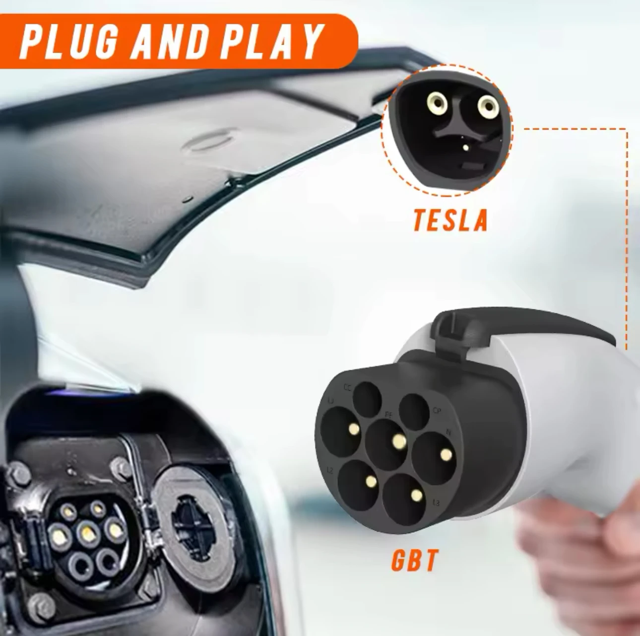 - The black, teardrop-shaped housing on the station side contains two smaller round sockets and a latch mechanism, optimized for compatibility with GBT standards and regional electrical specs.