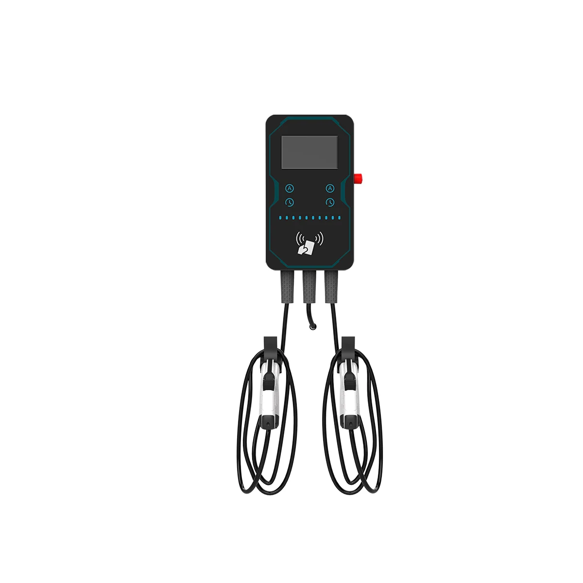 Experience seamless electric vehicle charging with this sleek, modern WUFEN EVSE wall-mounted station. Its minimalist rectangular design, featuring rounded corners and a durable black metal finish, adds a sophisticated touch to your charging setup. The central touchscreen display, surrounded by a subtle turquoise outline, provides an intuitive interface, while the four tiny indicator lights and soft blue control buttons enhance its futuristic look. Equipped with thick, rugged black cables and ergonomic handles—one black round shape, the other streamlined white—this charger ensures easy connection and handling. With double-gun configurations available, it suits multiple EV models, offering efficiency, durability, and style all in one compact unit. Upgrade your electric charging experience today and enjoy reliable power whenever needed.