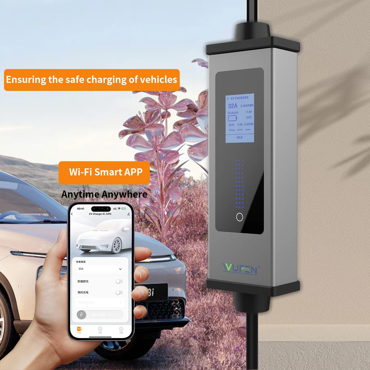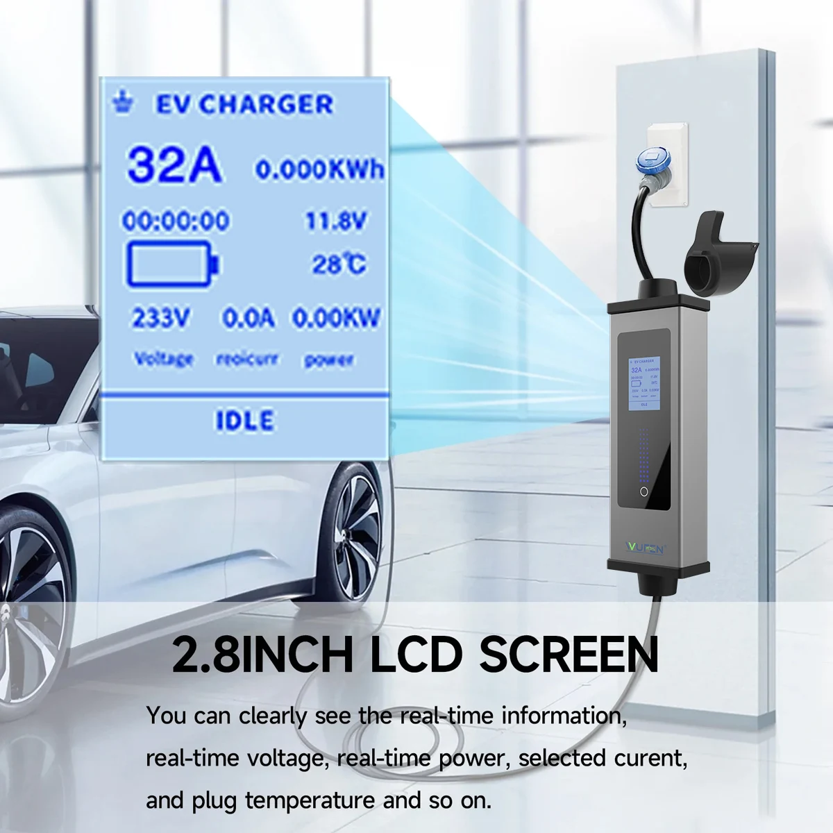 Experience seamless and reliable electric vehicle charging with this WUFEN GBT portable EV charger. Designed with a sleek, modern aesthetic, it features a durable matte gray and black finish, complemented by a clear, blue-backlit LCD screen that displays real-time charging information. Its vertical rectangular shape with smooth, minimalist lines exudes sophistication while emphasizing robustness and safety. The 5-meter black charging cable coiled neatly at the lower section offers freedom of movement, and the vibrant blue connector socket with gold-plated pins adds a touch of style. Perfectly suited for outdoor wall-mounted installation, it combines high performance with a luxurious yet practical design. Its weatherproof construction ensures safe operation in various environments, giving you peace of mind, day or night, rain or shine.