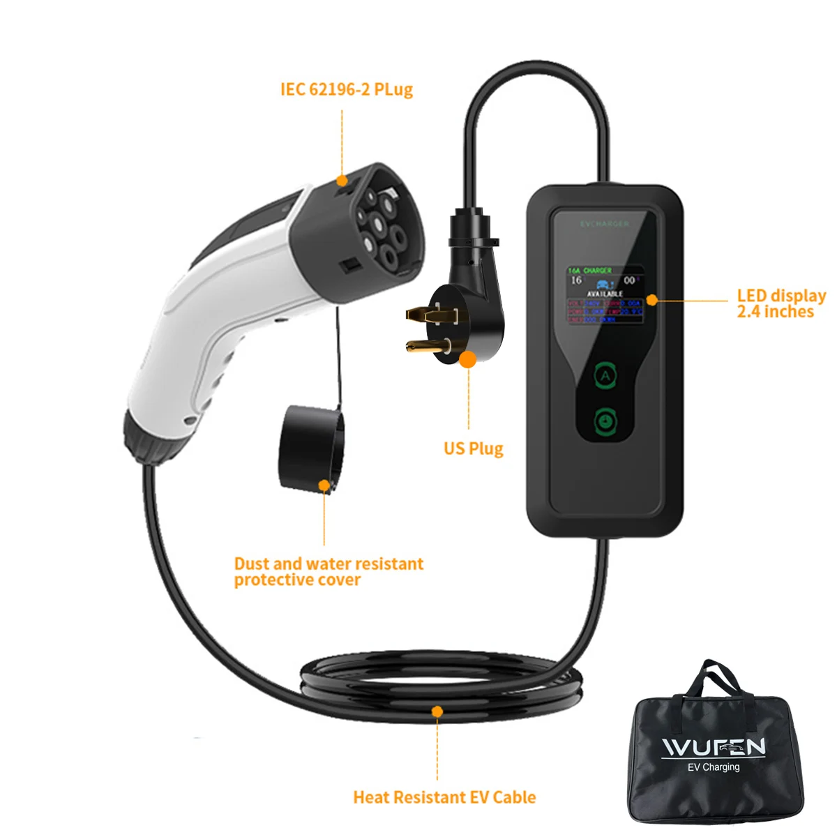 Experience effortless charging with this sleek, durable WUFEN Level 2 Electric Vehicle Charger, designed for outdoor use. Its matte black finish adds a modern touch, blending robust material with sophisticated style. The 5-meter cable is flexible and coated with a textured, weather-resistant cover, ensuring durability against dust, water, and outdoor elements. The rounded IEC 62196-2 Type 2 connector features a bright orange label for easy identification, offering a secure grip and reliable connection. The compact control unit with a vibrant colored LED display provides real-time charging parameters, making your charging experience intuitive and convenient. Whether for daily commuting or weekend trips, this charger offers you peace of mind with its weatherproof design and high-performance specifications.