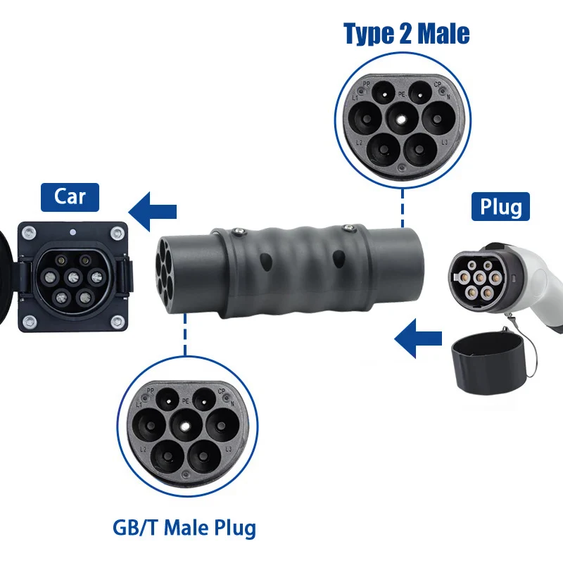 Experience seamless charging with this robust WUFEN Type2 to GBT EV adapter, designed for reliable power transfer in various conditions. Crafted from high-quality ABS, PC, copper, and silver, it offers exceptional durability and corrosion resistance. Its sleek cylindrical shape in matte black delivers a modern yet practical look, perfect for professional or personal use. The textured grip enhances handling, while the carefully engineered circular connectors ensure secure, stable connections with GBT standard vehicles and Type2 charging stations. Rated at IP54 waterproof standard, this adapter withstands harsh weather, making it perfect for outdoor or industrial environments. Whether you need a 7.2KW (220V, 32A) or a 22KW (480V, 32A) power level, it offers versatility and high performance, ensuring fast, safe, and reliable charging every time.