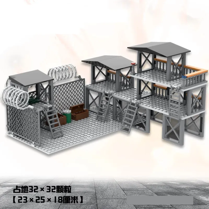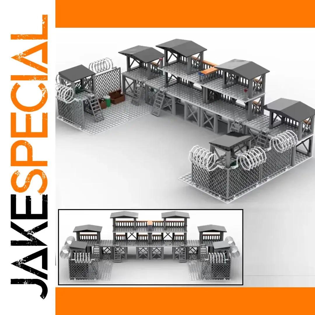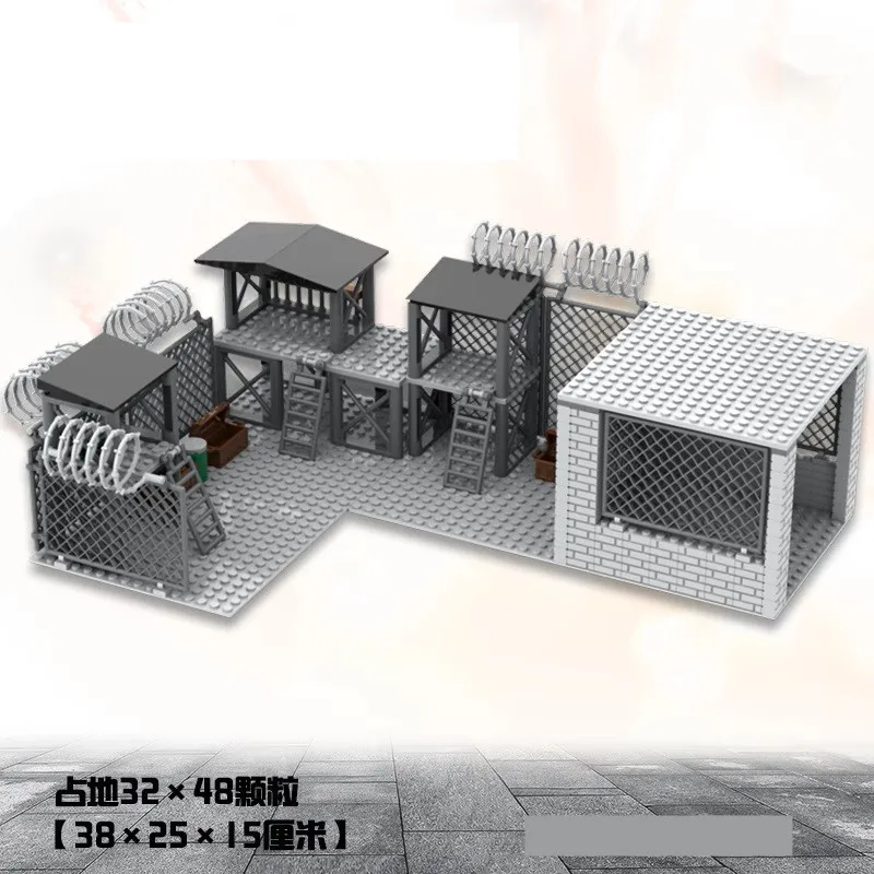 - Constructed with precision-engineered interlocking bricks, including chain-link fences topped with coil-like barbed wire, mimicking authentic security features of military bases.