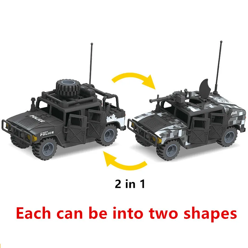 - Features two operational modes, allowing users to switch between an armored vehicle and army car, enhancing playability and display versatility. Designed with detailed, precise contours and textured accents.