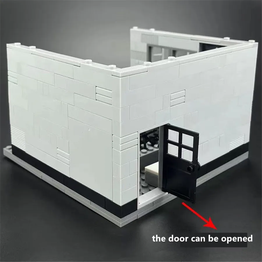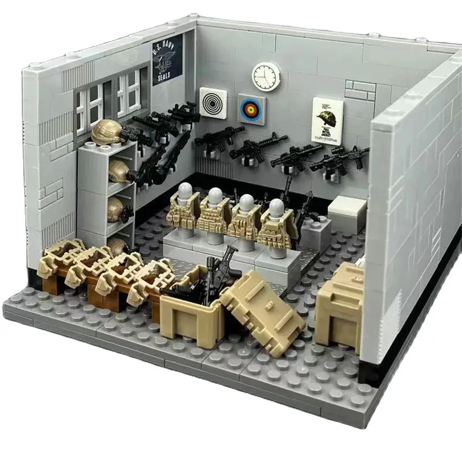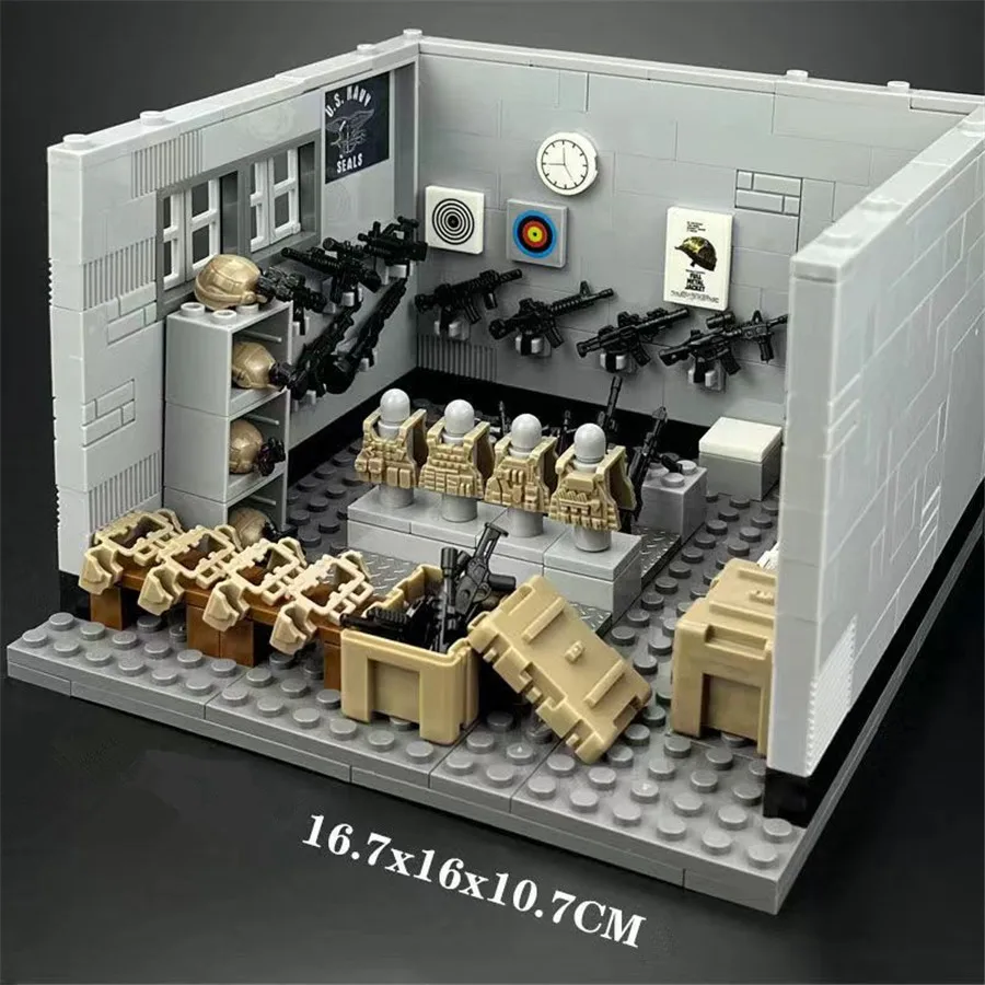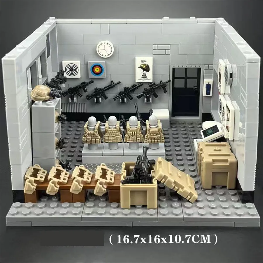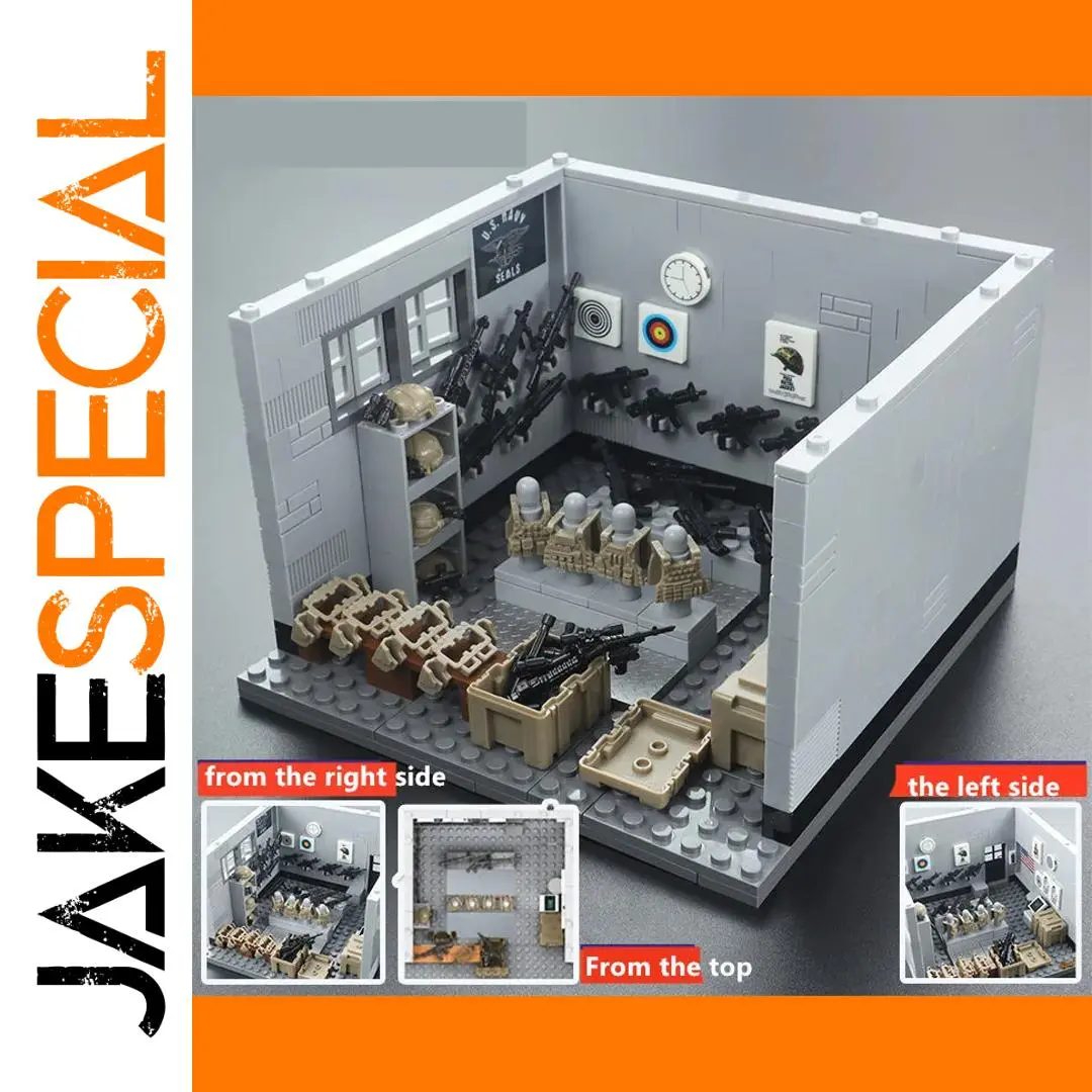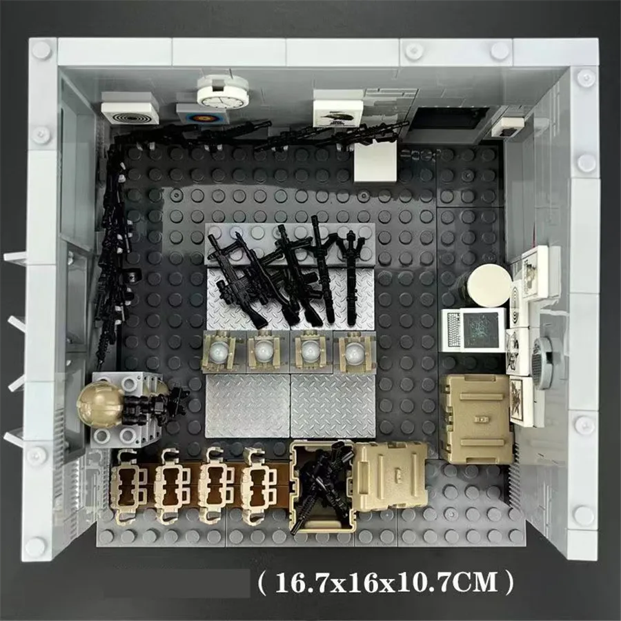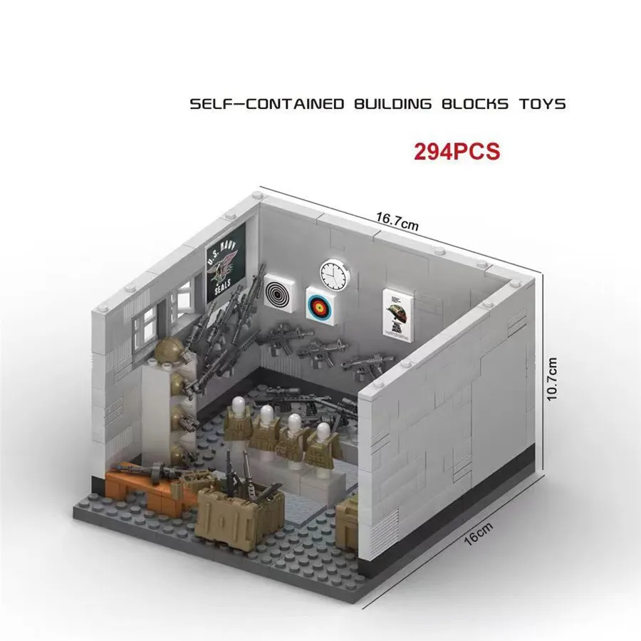 Create a highly detailed WW2 military weapon warehouse with this 294-piece set of plastic building blocks, crafted from durable ABS material with self-locking design for stability. Designed for ages 14 and above, this unisex model features a white rectangular structure with textured brick and paneling surfaces. Inside, find realistic storage with mounted rifles, tan-colored helmets, shelves, crates, boxes, and detailed accessories like target posters and a wall clock. The realistic gray brick flooring, raised platforms with mannequins, and military-themed decor make it an ideal display or training model. Compact in size, it offers an immersive construction experience for military enthusiasts.