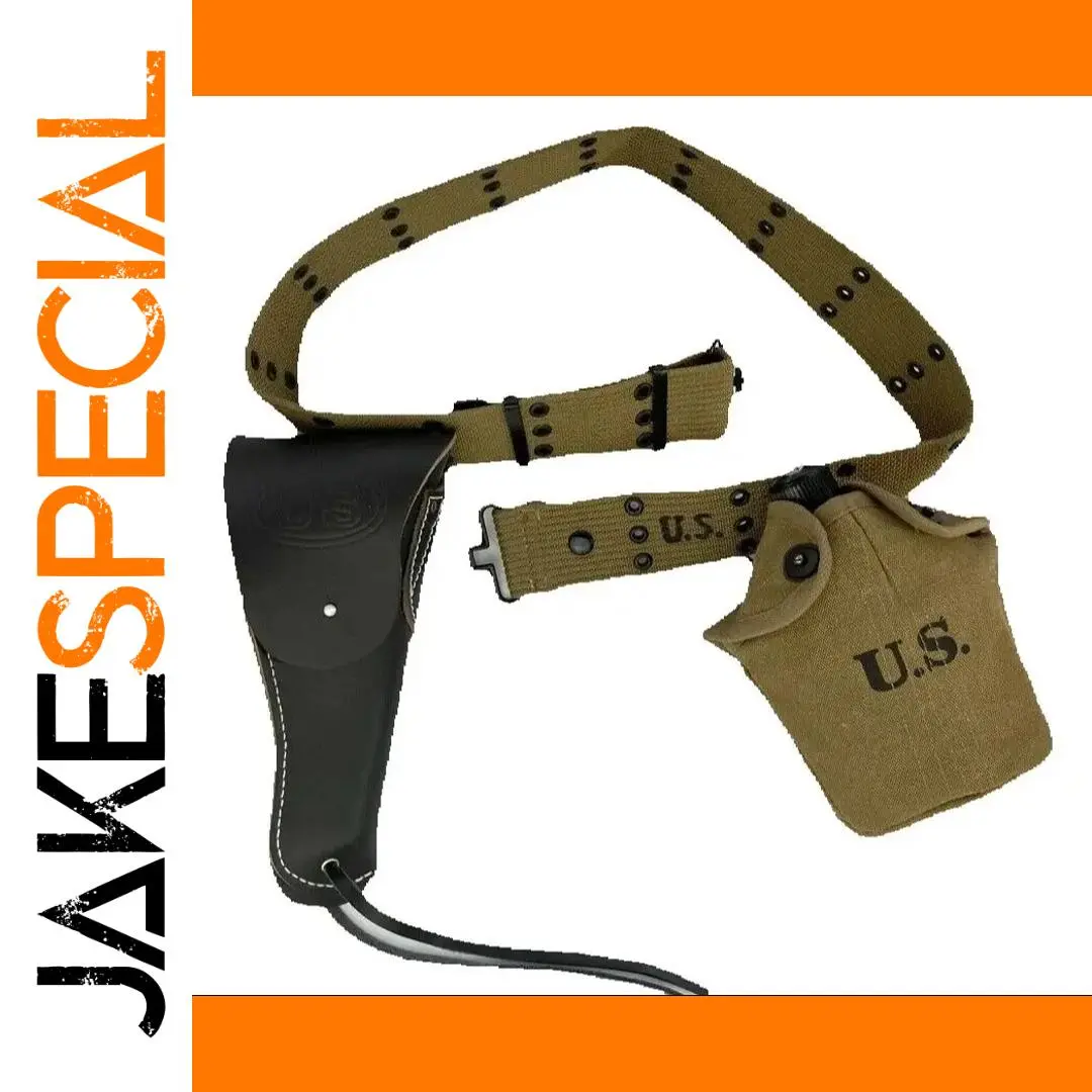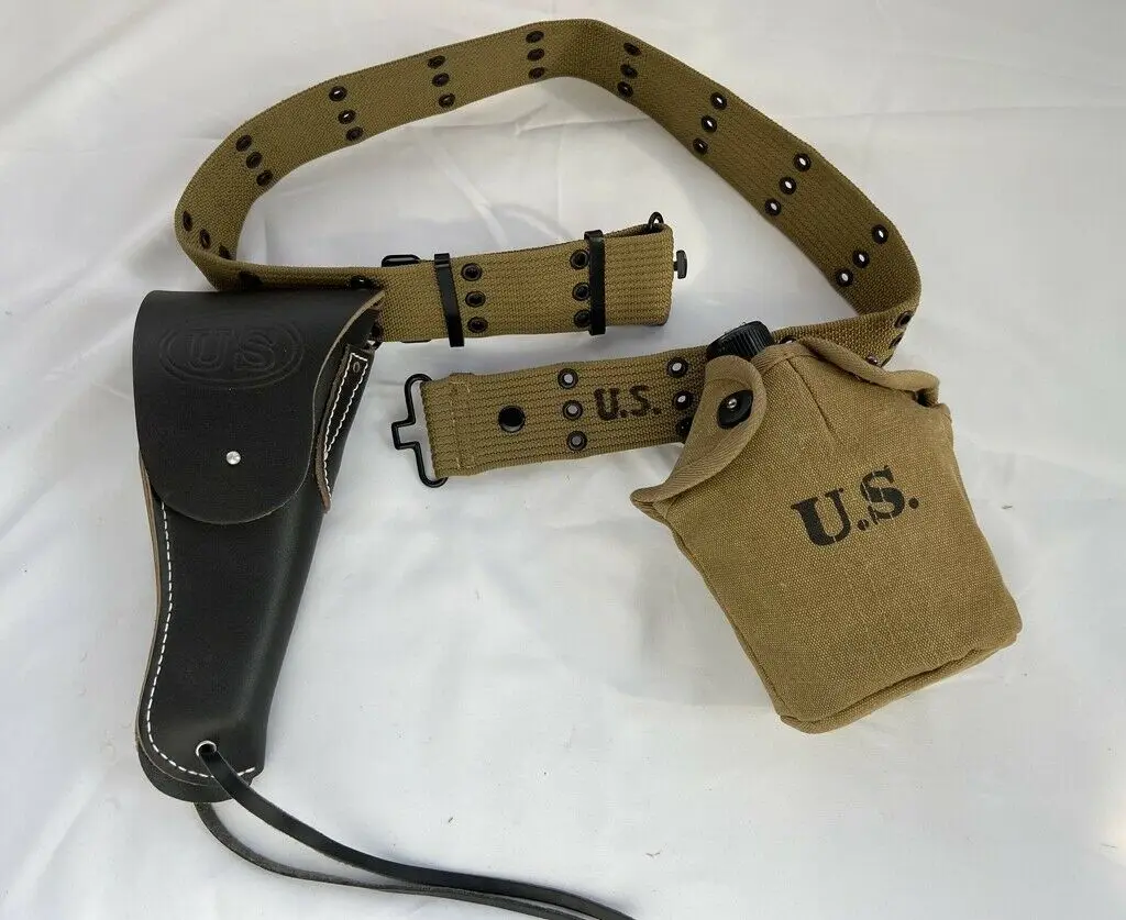 Experience a realistic portrayal of World War II military gear with this meticulously crafted reenactment set. The centerpiece is a high-quality black leather holster designed to perfectly fit the WW2 US Colt 1911 pistol, featuring durable stitching, a rounded flap with a secure snap closure, and a small attachment hole. Complementing the holster is a tan or khaki fabric belt with reinforced black metal rivets and eyelets, stamped with the iconic “U.S.” markings for authenticity. Included are a matching tan fabric canteen and kettle, both with drawstring closures and fabric covers that mirror traditional military supplies. This complete set enhances your collection or reenactment, offering a vintage aesthetic rooted in historical accuracy and craftsmanship.
