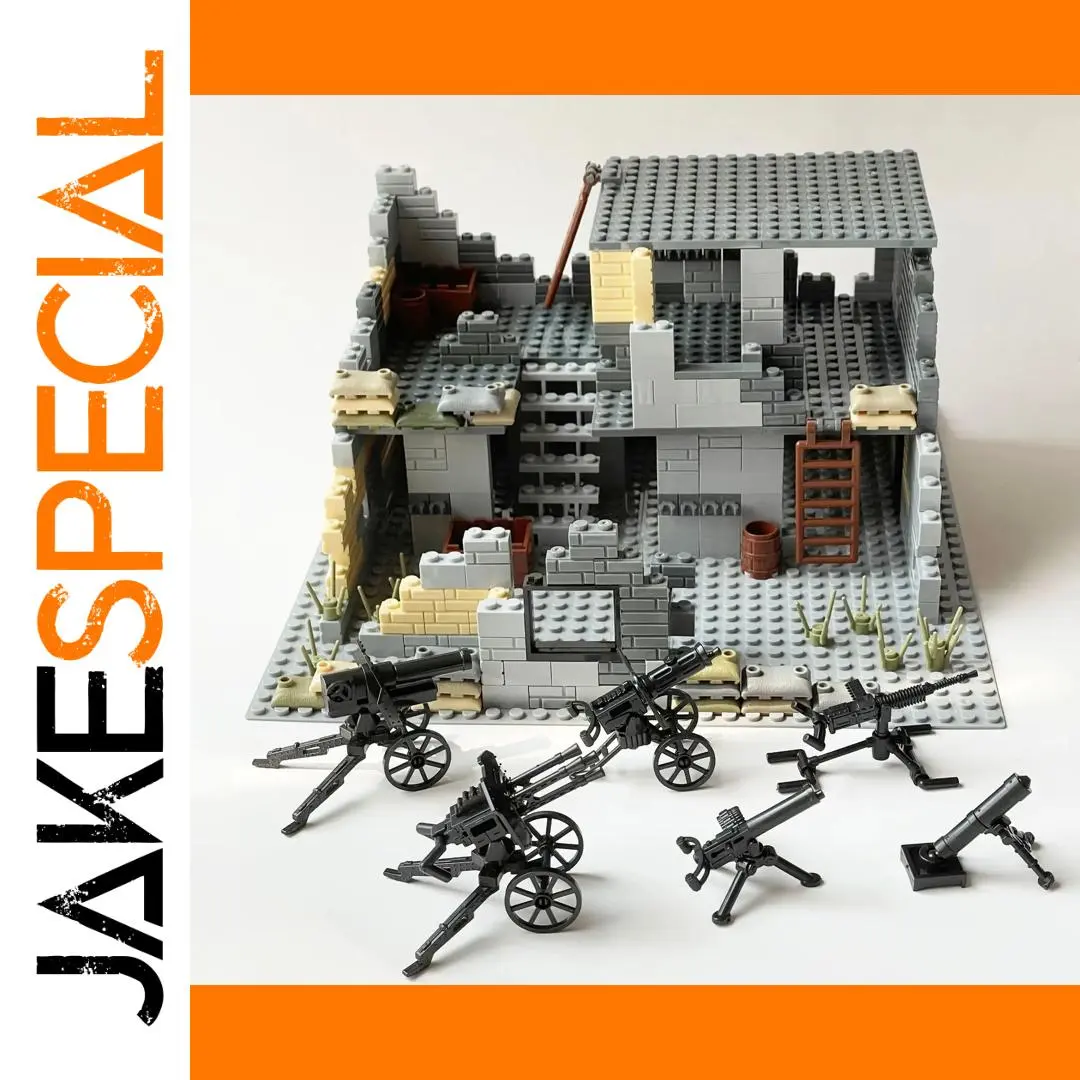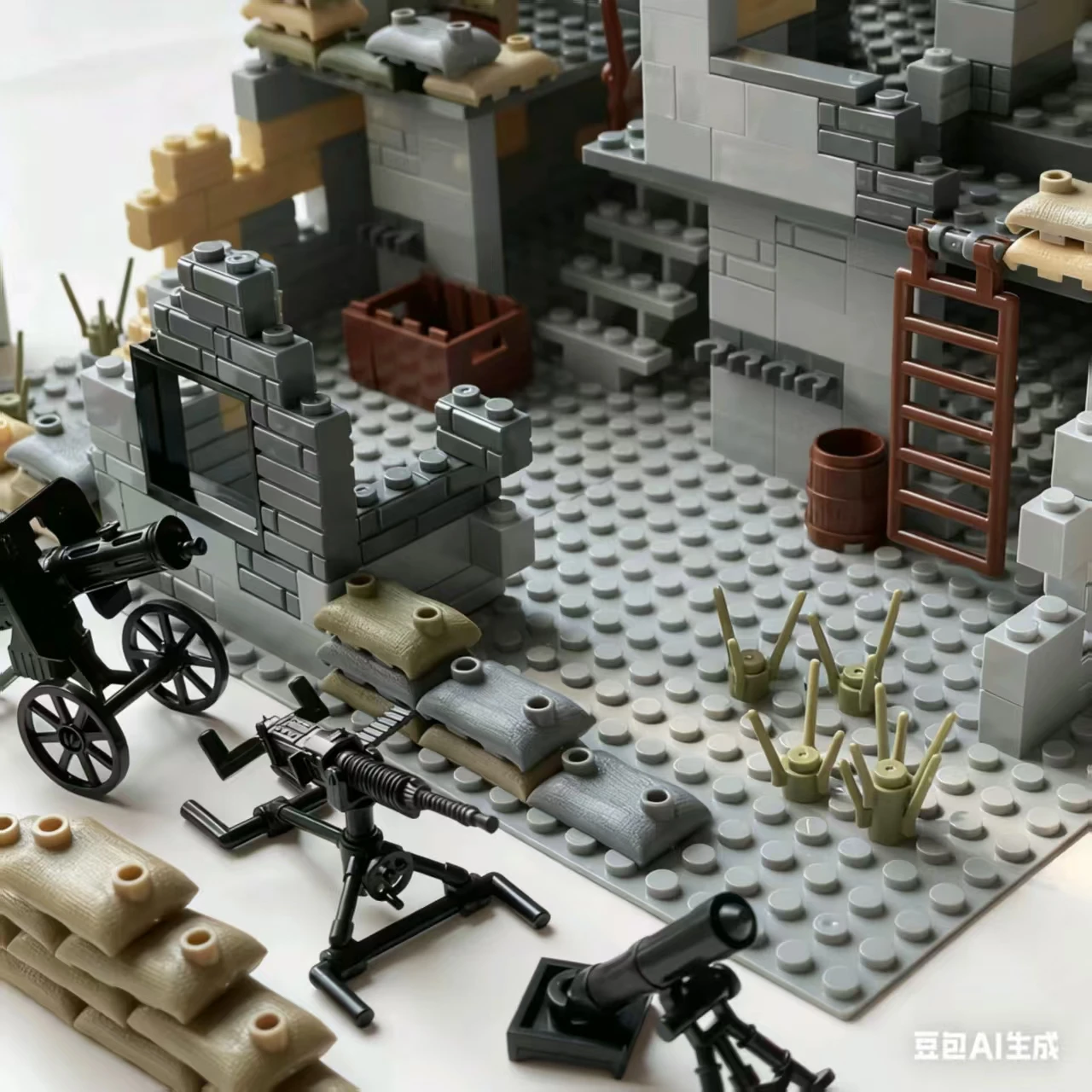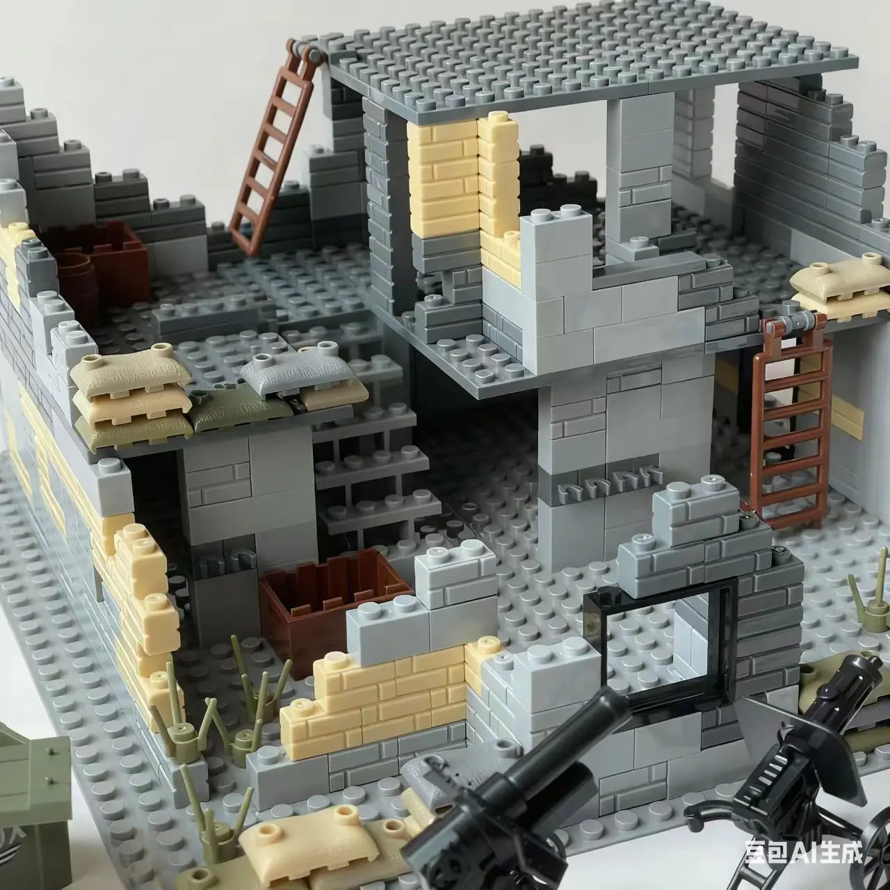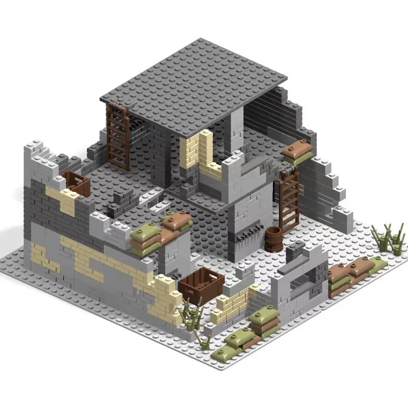 Immerse yourself in this realistic WWII abandoned military defense base scene, crafted from durable plastic building blocks. Featuring an intricate ruined structure, the scene showcases damaged walls, rubble, and makeshift repairs in shades of gray, creating a rugged, war-torn atmosphere. Complemented with detailed accessories like barrels and scattered debris, it sparks your imagination to recreate battlefield scenarios. With various weapon accessories such as cannons and machine guns on tripods and wheels, it offers an exciting and immersive experience. Designed for collectors and young builders alike, this set encourages creative storytelling, allowing you to build a highly detailed and authentic military outpost. Expand your collection and bring history to life with this engaging scene.