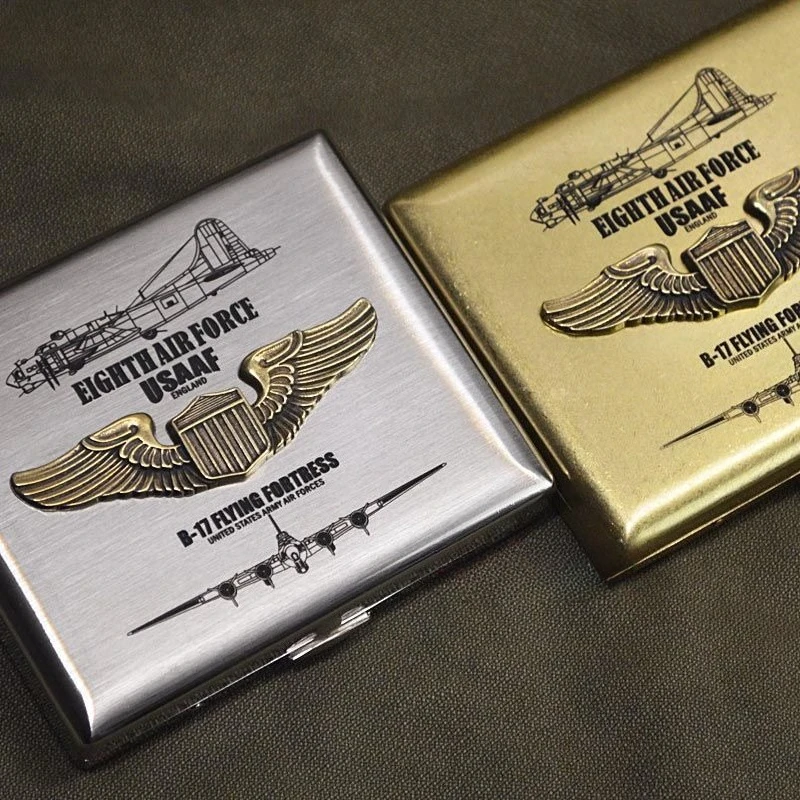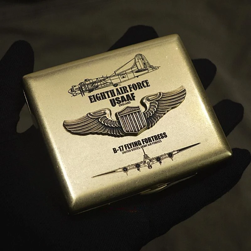 Discover a unique accessory that seamlessly blends vintage military charm with modern craftsmanship. Crafted from durable stainless steel with a sleek lacquer finish, this relief sticker features intricate embossed details: a pair of outstretched wings with a shield, a military helicopter, and a rear view of a B-17 Flying Fortress. The detailed black line drawings and embossed elements evoke nostalgia for WWII aviation history. Available in vintage copper and silvery hues, it’s designed to enhance medium and coarse metal cigarette boxes, offering a touch of collectible elegance. Transform your accessories, showcase your passion for military aviation, and elevate your collection with this meticulously crafted piece that blends historical allure with everyday functionality.