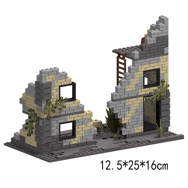 - Features a mix of beige and gray bricks to capture the weathered, abandoned appearance of ruins, with irregular shapes and damaged structures evoking realism of war zones.