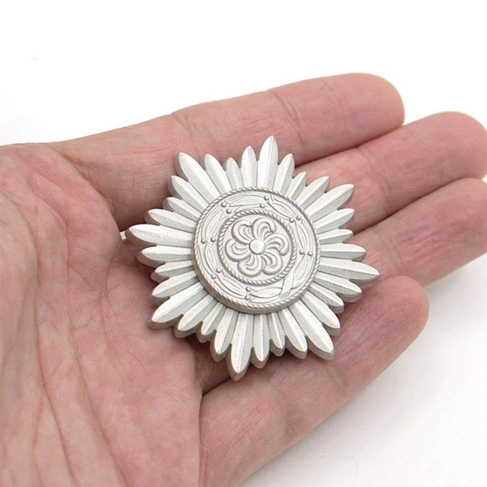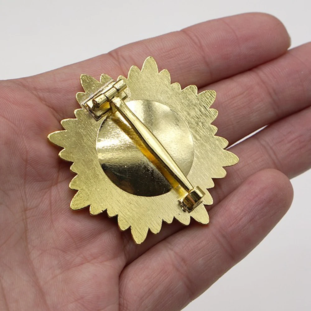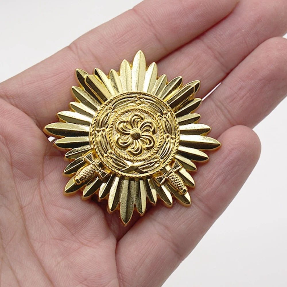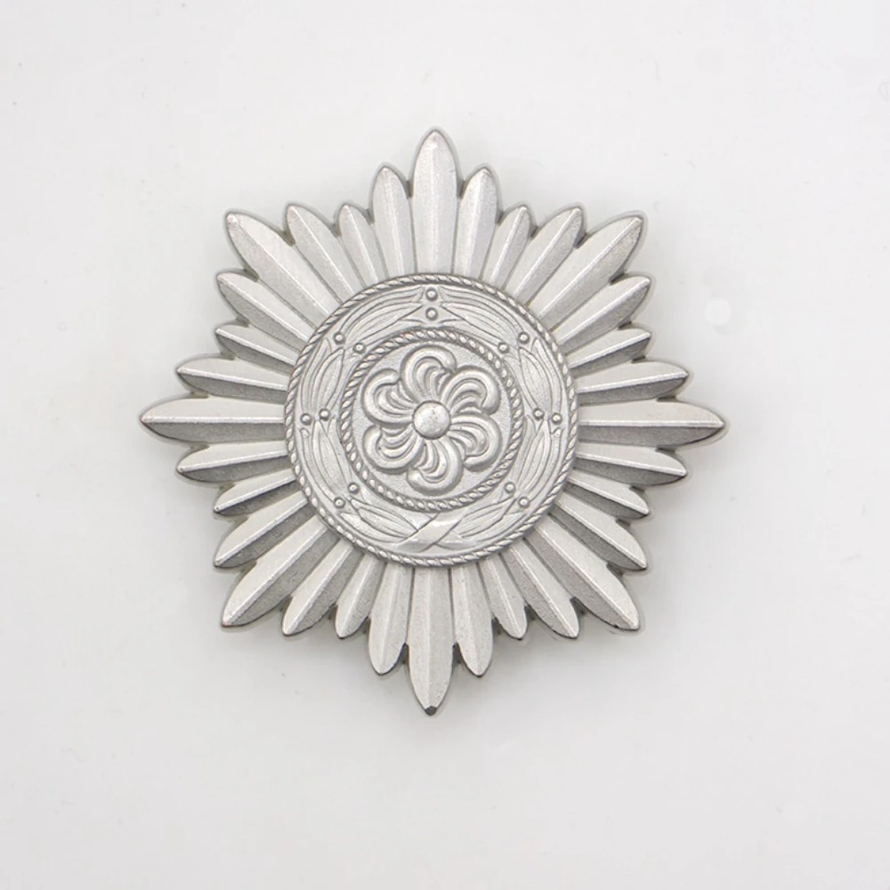 Imagine owning a piece that captures the nostalgic spirit of vintage military memorabilia. This WWII-themed pin medal boasts a polished, metal construction available in elegant silvery military, radiant golden, and combination options. Its intricate design features a central emblem of a raised fleur-de-lis, surrounded by textured concentric rings that add depth and detail. Radiating outward are elongated, curved rays forming a bold sunburst or starburst pattern, enhancing its dynamic, three-dimensional appeal. Its symmetrical, flower-like shape exudes elegance and strength, making it perfect for collectors or enthusiasts looking to add a regal touch to their display or outfit. This versatile pin is not just a souvenir but a statement piece of history, craftsmanship, and style.