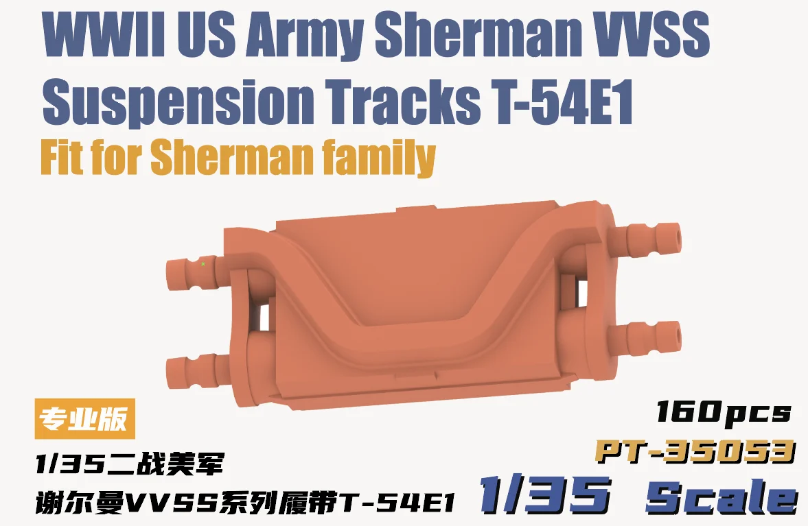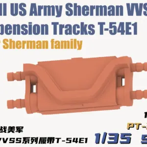 Enhance your WWII model collection with these 1:35 scale US Army Sherman VVSS suspension tracks, meticulously designed to replicate the T-54E1 tank. Crafted from high-quality plastic, these detailed track components feature a solid, reddish-brown finish typical of unpainted parts, with realistic ridges, indentations, and precise attachment points. The rectangular, elongated pieces include small cylindrical protrusions at each end for easy assembly, making them ideal for advanced hobbyists aged 18 and above. Perfect for creating authentic, detailed military models, these suspension tracks combine structural realism with functional complexity, ensuring your scale model project stands out with fine craftsmanship.