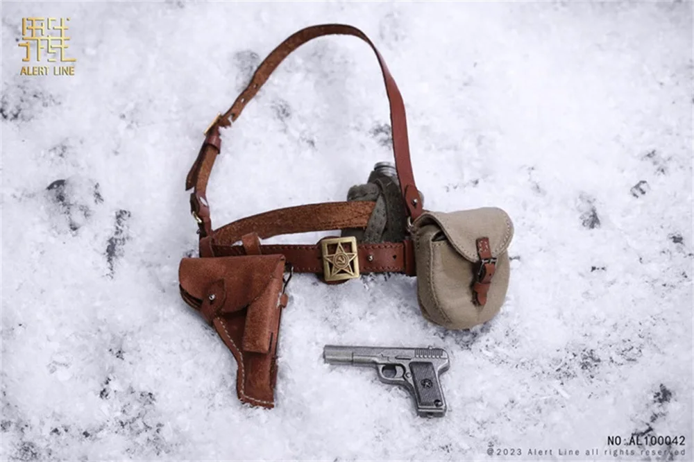 Experience the rugged charm of this this WWII series Soviet Mountain Army leather waist and shoulder belt set, specially crafted for 12-inch action figures. Made from durable PVC, these accessories feature a vintage military aesthetic with detailed stitching and textured surfaces that replicate real metal or plastic containers. The set includes a distinct star-shaped buckle with a gold-colored finish, adding an authoritative touch. Complete with functional pouches such as water bottles, drum bags, and map bags, this set offers realistic, tactical detail perfect for display or cosplay. Its versatile design allows for customization, giving you an authentic military look. Crafted for collectors, it perfectly blends realism with historical tribute, enhancing your model's authenticity.