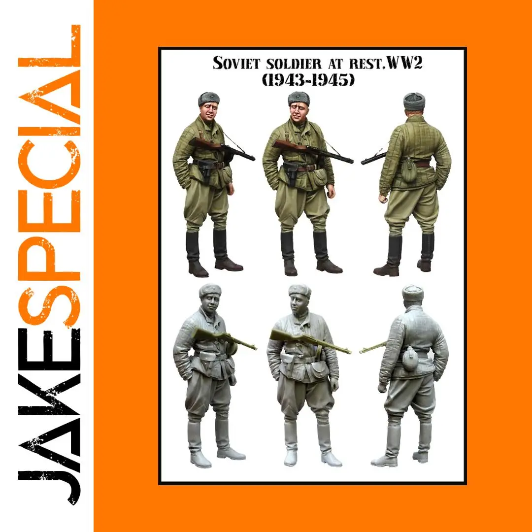 This highly detailed 1/35 scale resin figure kit depicts a Soviet soldier at rest, featuring realistic uniform textures, a fur hat with a rounded crown and short brim, black boots, and accessories like pouches, a holster, and a small bag. The unassembled, unpainted kit is crafted from resin with precision sculpting showing folds, creases, and facial features for advanced modelers. It is designed solely for hobbyist customization, requiring user assembly and painting. Suitable for ages 18 and above, this static figure offers excellent craftsmanship and historical authenticity, perfect for collectors and enthusiasts eager to create a personalized military diorama.