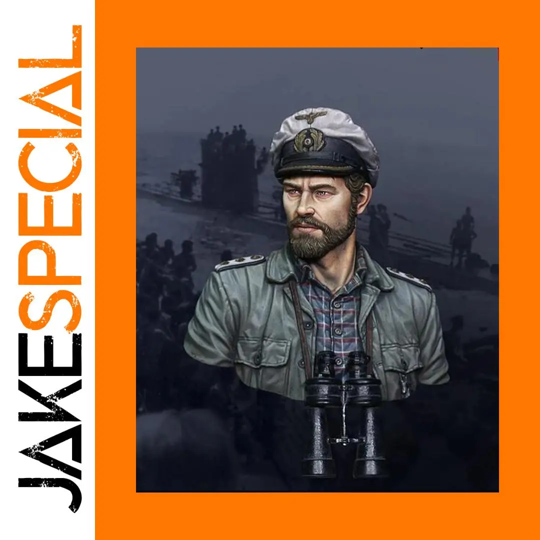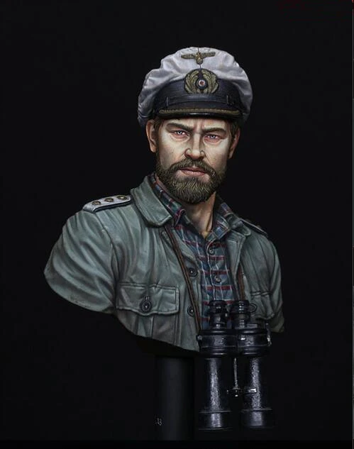 Step into the world of maritime history with this highly detailed and realistic WWII submarine commander bust resin model kit. Designed for adult collectors and hobbyists, this unassembled 1/10 scale figure captures the commanding presence of a naval officer with impeccable accuracy. The model features a somber, authentic color palette of muted gray, green, and beige, emphasizing its historical and military realism. Its finely sculpted facial features showcase a focused, serious expression with piercing eyes and a full beard, complemented by a classic naval cap adorned with insignia and piping. The textured uniform, complemented by elements like binoculars hanging at the neck, brings remarkable authenticity to the piece. Perfect for enthusiasts seeking a challenging and rewarding project, this kit allows you to craft a unique maritime masterpiece that exudes realism and history.