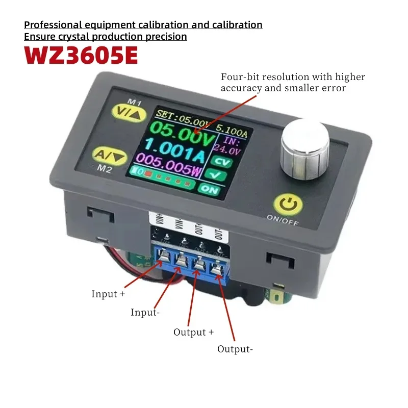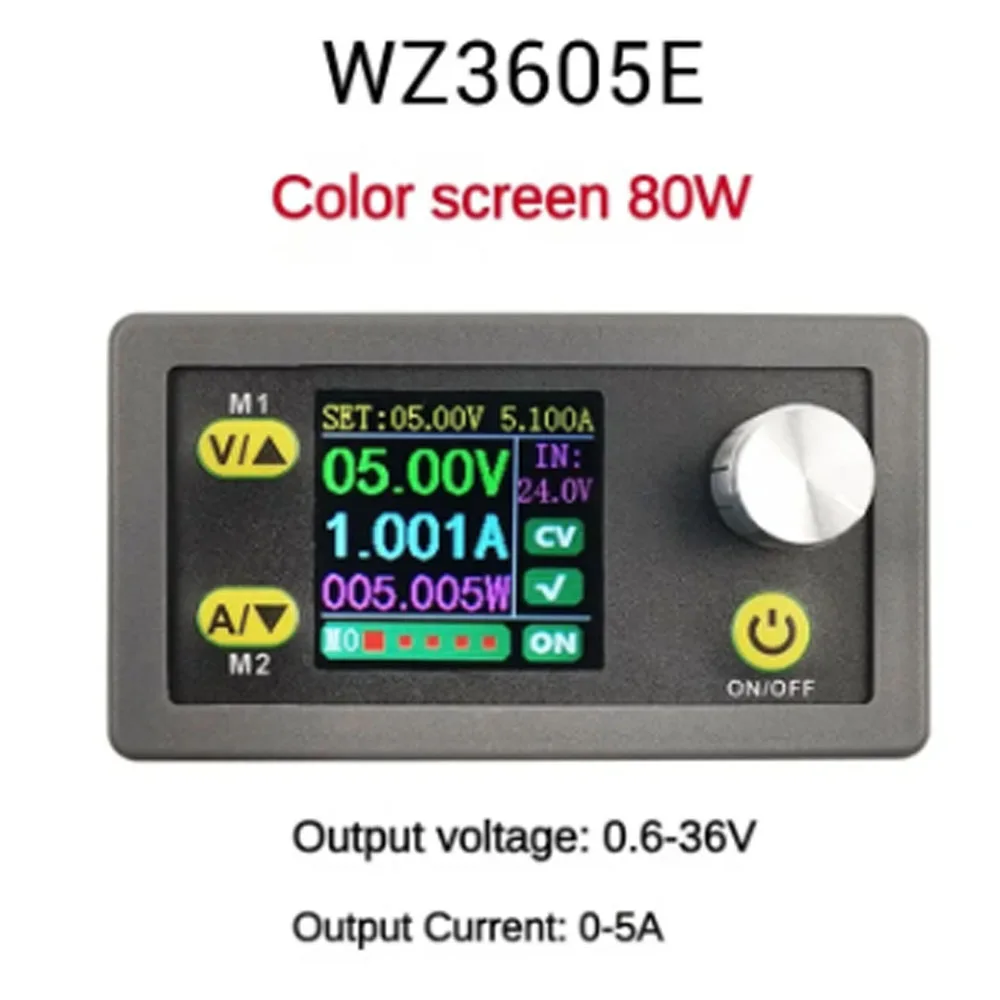 Experience precise control with the WZ3605E 36V 5A adjustable DC power supply, featuring a compact design and a vibrant 1.44-inch high-definition color LCD display for clear multi-parameter readings. Adjustable output voltage from 0.6V to 36.00V and current from 0A to 5.000A ensure versatility for various applications. Equipped with CV/CC regulation, multiple safety protections, and professional calibration for high accuracy, this 80W power supply also supports storing up to 10 preset configurations for quick access. Its sleek, modern aesthetic combines functional controls with colorful indicators, making it an ideal choice for precise electrical testing, development, and repair tasks.