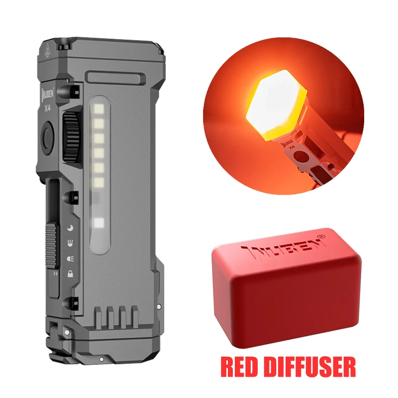 Experience the cutting-edge style and functionality of the this X4 RGB Flashlight. Its compact, rectangular form is crafted from high-quality aluminum alloy, finished in a modern, metallic light grey. Designed with a rugged yet refined aesthetic, it combines industrial inspiration with practical details such as textured grip sections, a ridged rotary switch, and a magnetic tail cap. The top features four prominent LEDs arranged vertically, providing powerful illumination. A side RGB light with adjustable colors adds a vibrant touch, perfect for signaling or mood lighting. Whether for outdoor adventures, professional tasks, or emergency use, this flashlight’s modern design ensures durability, versatility, and convenience in every situation.