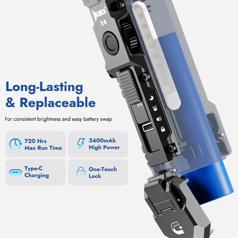 - Rechargeable 3400mAh 18650 battery supports fast USB-C charging, ensuring reliable power on the go, with options for replacement batteries for extended use.