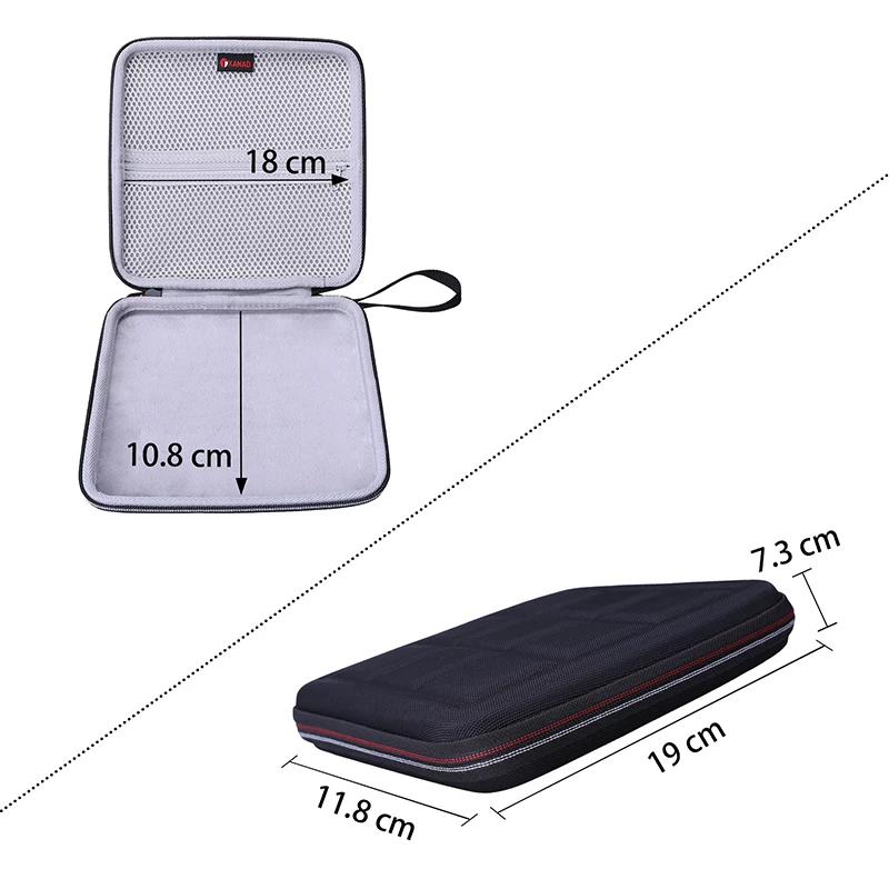 - Technical specifications include: external dimensions 7.5″ L, 4.6″ W, 2.9″ H; material: EVA; water-resistant, shockproof design; durable zipper and handle for reliable use.