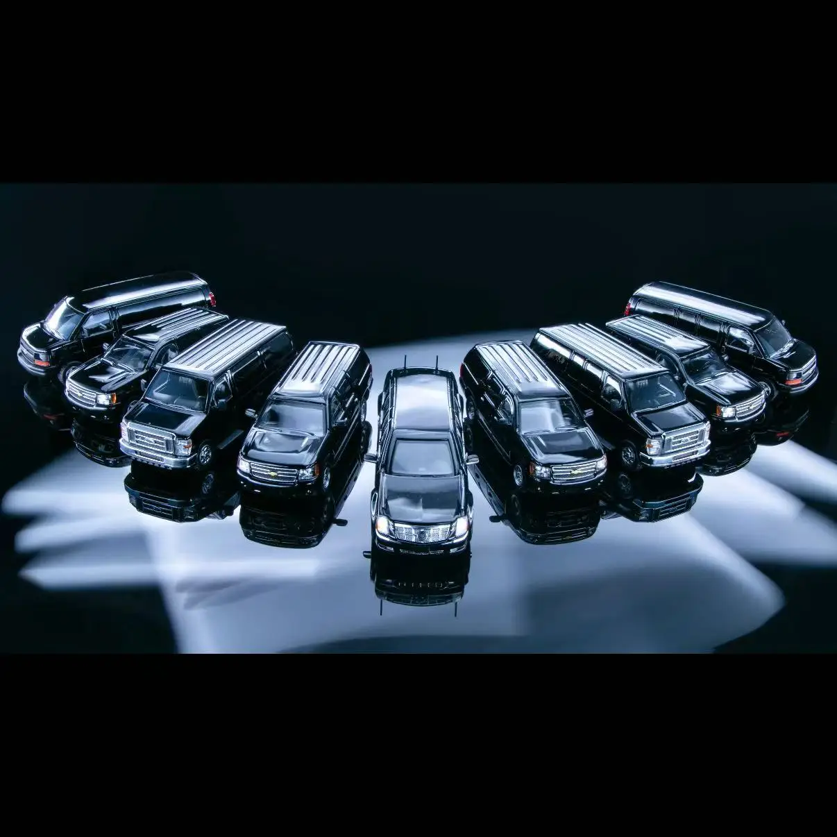 Introducing the XCARTOYS 1:64 Beijing Model Exhibition President 9 Car Set, featuring a collection of nine sleek black die-cast miniature cars made from durable metal and alloy materials. Each model showcases a glossy finish with chrome accents, highlighting the intricate details of modern SUVs and limousines. The entire set measures approximately 25 cm, creating an impressive display for collectors. With no electric components or batteries required, this non-electric toy is designed for enthusiasts over 14 years old, perfect for enhancing your model collection with elegance and sophistication.