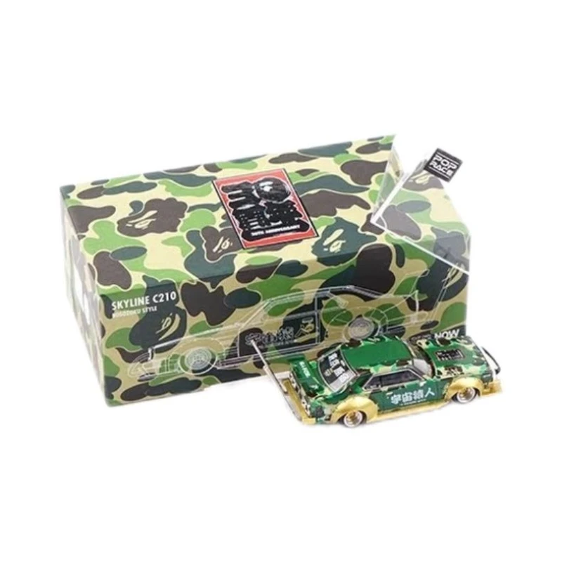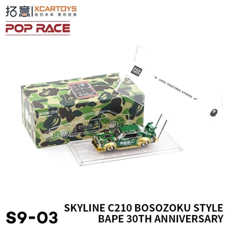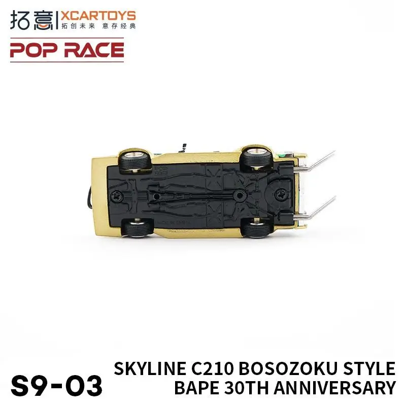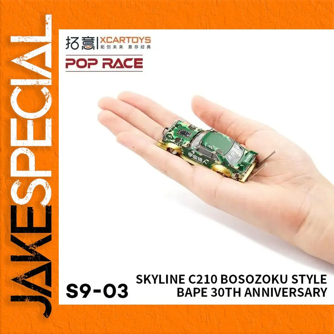 Introducing the XCARTOYS S9-03 diecast miniature simulation car model, a stunning 1:64 scale representation of the iconic Skyline C210 in a captivating Bosozoku design. This model features a vibrant green body adorned with intricate gold and silver patterns, complete with detailed decals and Japanese text that enhance its cultural aesthetic. Crafted from durable metal and alloy, it measures approximately 7 cm, making it a perfect addition to any collection. With no batteries or electrical components required, it is designed for static display and play, inviting you to admire its unique artistry and craftsmanship. Keep it away from fire for safe enjoyment.