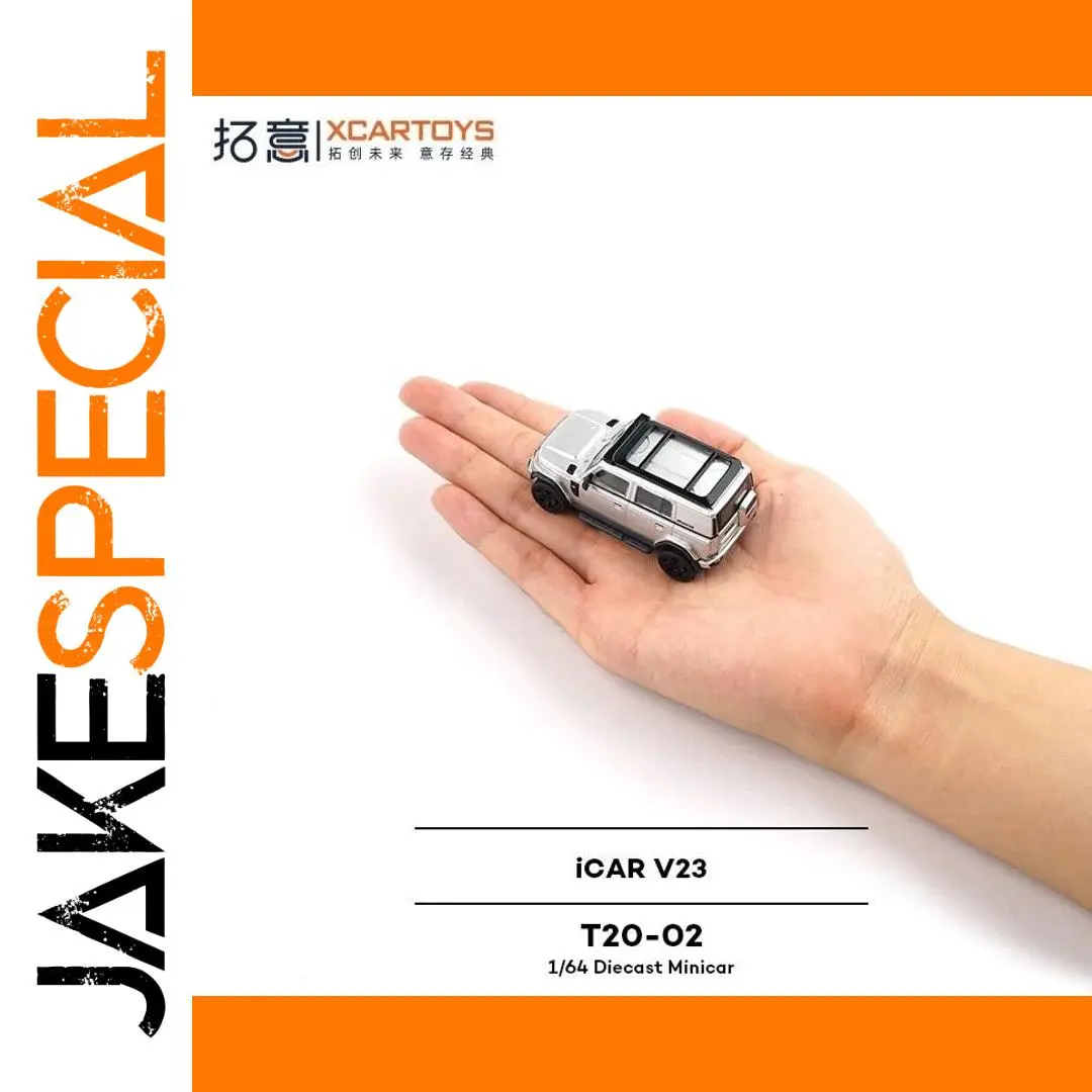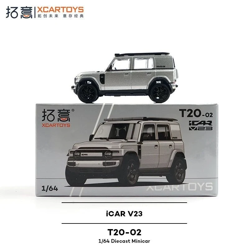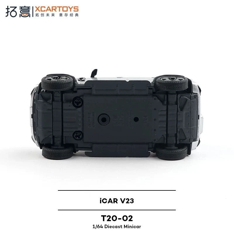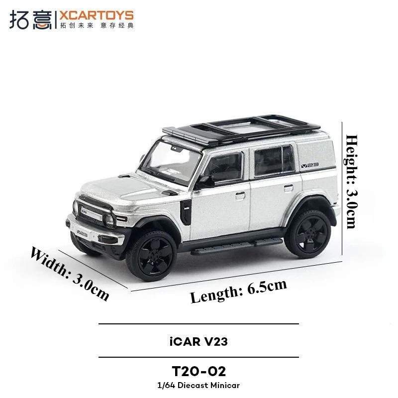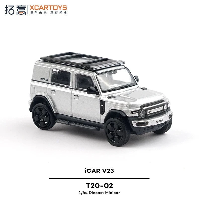 Experience the thrill of off-road adventures with this highly detailed diecast model of the XCARTOYS 1/64 Scale iCAR V23. Crafted from durable metal, this miniature vehicle captures the essence of a rugged SUV with impressive accuracy. Its sleek silver body features contrasting black accents on the wheels, lower body, and roof frame, highlighting its sturdy, off-road presence. The prominent wheel arches and elevated stance give it an assertive, adventurous look. A transparent section on the roof suggests a panoramic sunroof, adding sophistication. Fine detailing on the grille, headlights, and side mirrors makes this model a realistic collector's item or an engaging toy for enthusiasts. It’s perfect for display or imaginative play, capturing the rugged charm of a full-sized SUV in a compact form.