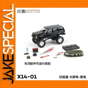 Elevate your collection with the stunning Xcartoys X14-01 model car, a finely-crafted piece designed specifically for automotive enthusiasts. This striking 1:64 scale SUV model is finished in a sleek, glossy black that emphasizes its unique contours and robust stature. The attention to detail is apparent in its oversized wheels, high ground clearance, and superior quality metal construction. You can imagine showcasing this model on your shelf, delighting in the craftsmanship every time you glance at it. Coupled with fun accessories like a blue cooler and red fire extinguisher, this car model effectively merges aesthetics with imaginative play, making it ideal for display or themed dioramas.