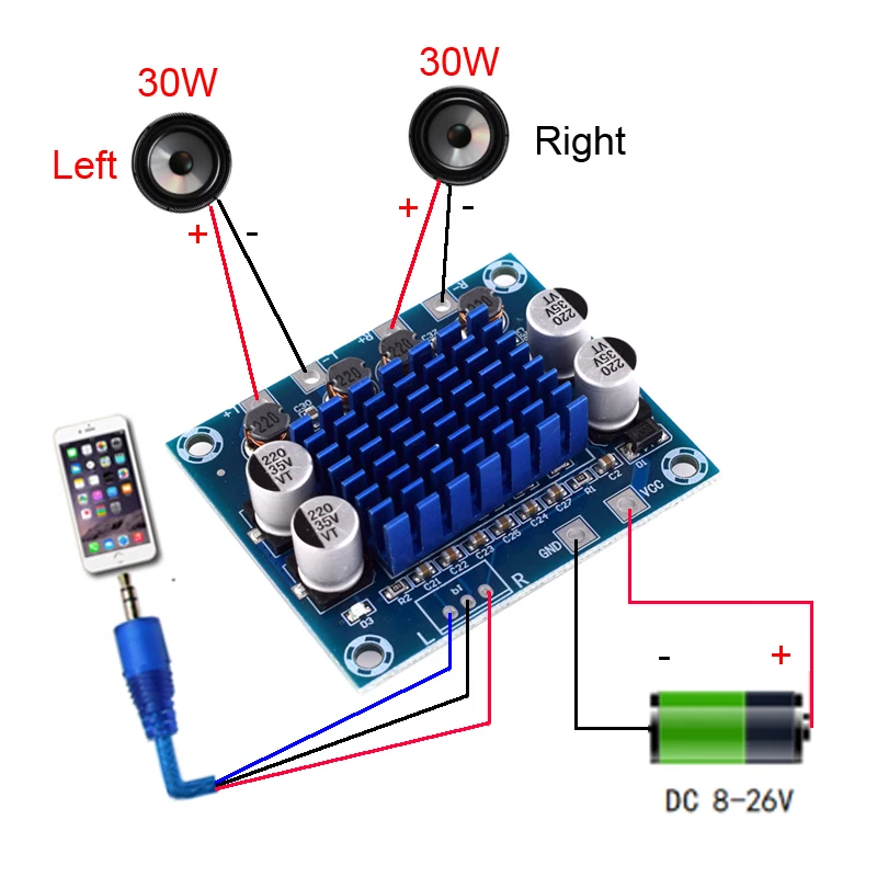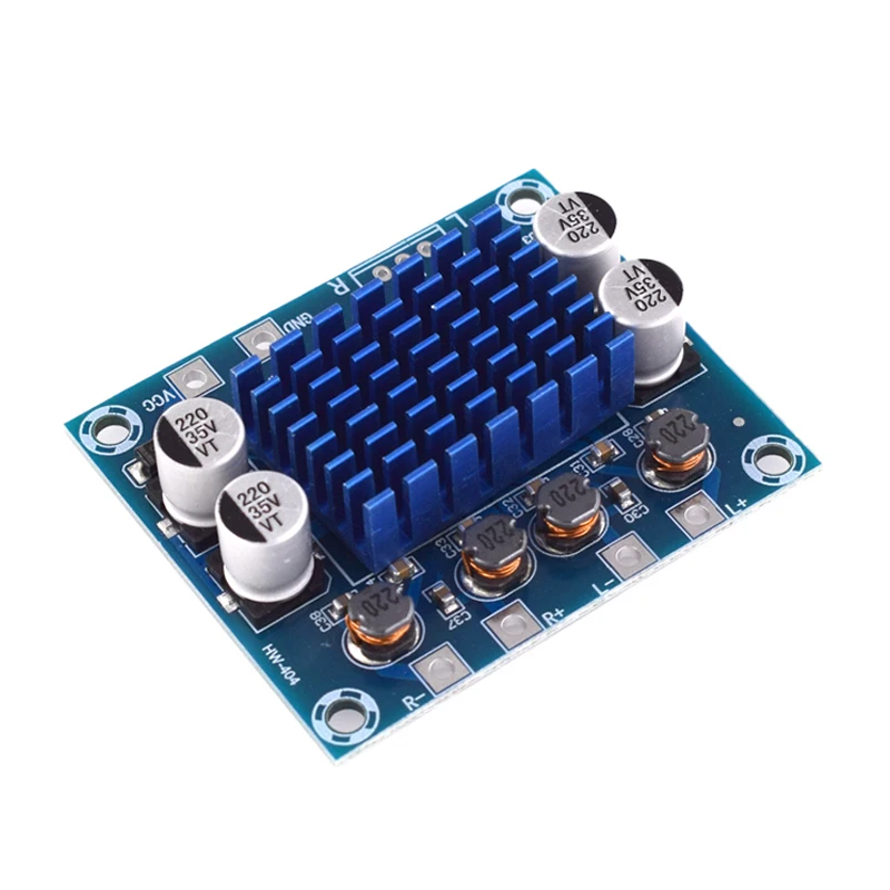 The XH-A232 is a compact 30W+30W dual channel digital stereo audio power amplifier board, measuring 43mm x 55mm x 14mm. It operates within a voltage range of DC 8V to 26V and a current rating of 3A. This Class D amplifier features an output power of 10W+10W per channel, with an output impedance of 4Ω to 8Ω and efficiency reaching up to 90%. The module supports an operating temperature range of -40°C to +85°C, distortion levels below 10%, and includes protective mechanisms for output short circuits and overheating with a self-recovery function, making it ideal for audio projects.